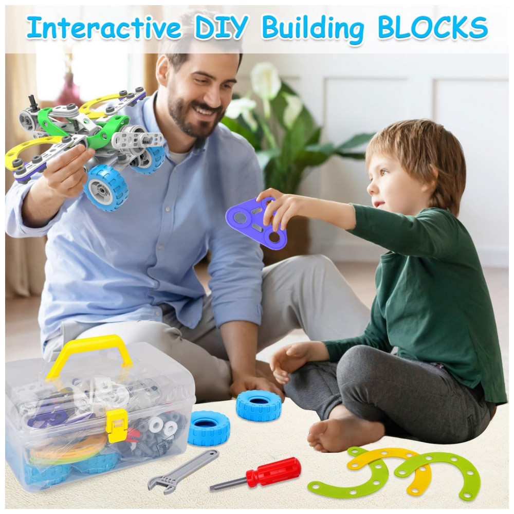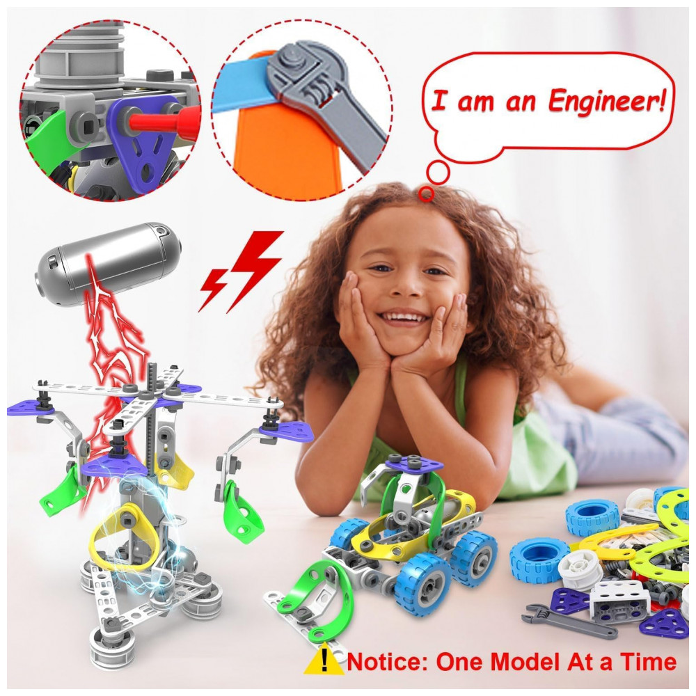 O uso do kit desenvolve coordenação motora fina e destreza manual ao encaixar blocos, posicionar eixos, montar o suporte de motor e fixar componentes em diferentes orientações. O brinquedo também estimula raciocínio lógico, planejamento de etapas, resolução de problemas, percepção espacial e criatividade, principalmente quando a criança compara o funcionamento dos diferentes modelos elétricos e ajusta a construção para melhorar estabilidade e movimento.