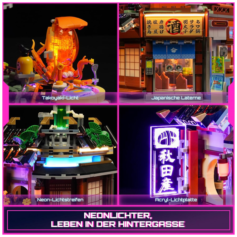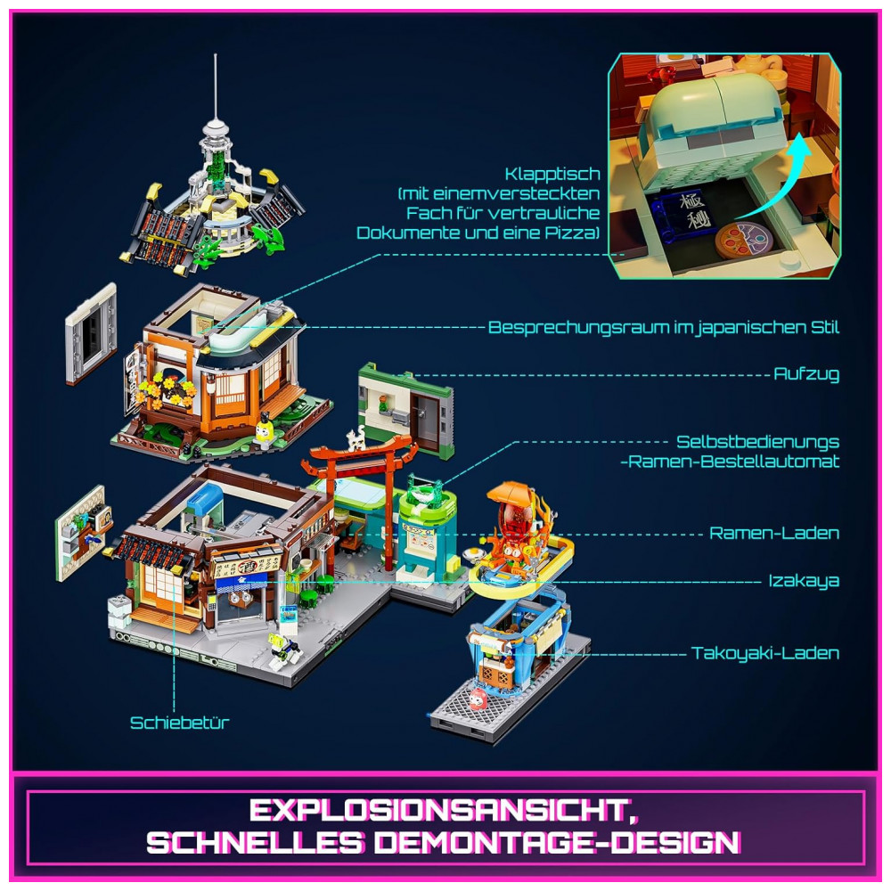 O modelo inclui uma izakaya (pub japonês tradicional) com três paredes removíveis, duas portas deslizantes e elevador funcional. O restaurante de ramen conta com teto destacável e uma máquina interativa de venda de noodles. A barraca de takoyaki é destacável para uso independente, ampliando as possibilidades de montagem e brincadeira modular.