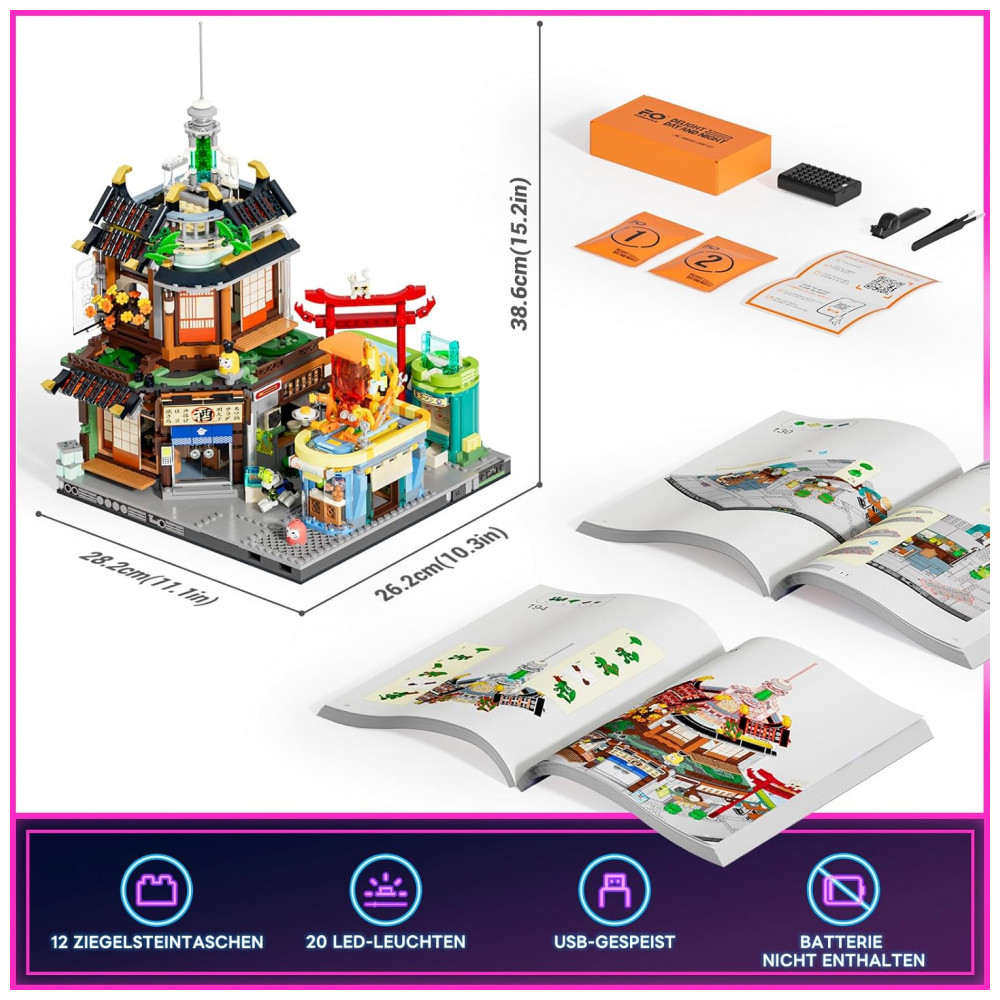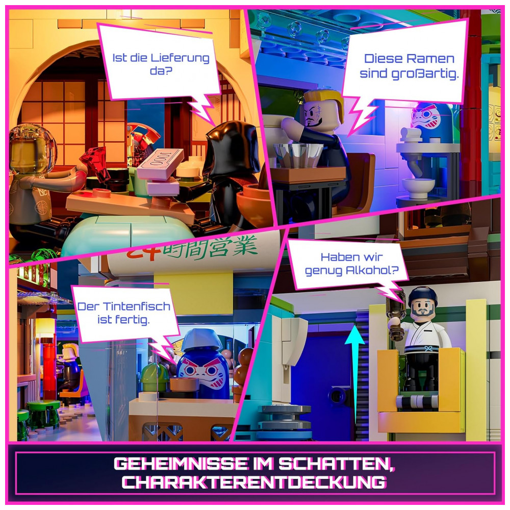 O kit de blocos de construção FUNWHOLE Izakaya Japonês Cyberpunk reúne 1987 peças plásticas de alta resistência para montar um modelo detalhado de uma rua futurista neon com tema japonês. O conjunto reproduz elementos arquitetônicos tradicionais, como telhados retro, portas de correr de papel e lanternas, combinados com estruturas metálicas e decorações tecnológicas em estilo cyberpunk.