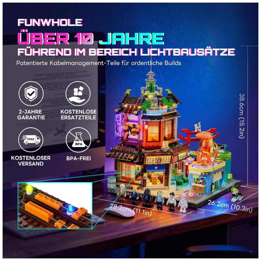 Kit Construção FUNWHOLE Izakaya Japonês Cyberpunk com Iluminação LED 1987 Peças Sistema Modular USB Modelo F9073