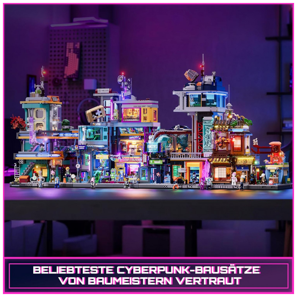 Um diferencial do produto é o sistema modular de iluminação LED, que utiliza conexão USB única para alimentar 18 pontos de luz em múltiplas cores – amarelo vibrante, azul gelo, roxo, vermelho e multicolor – criando uma ambientação autêntica de cidade neon cyberpunk. As luzes estão estrategicamente posicionadas em fachadas e placas, garantindo um efeito visual realista de cenário noturno urbano.