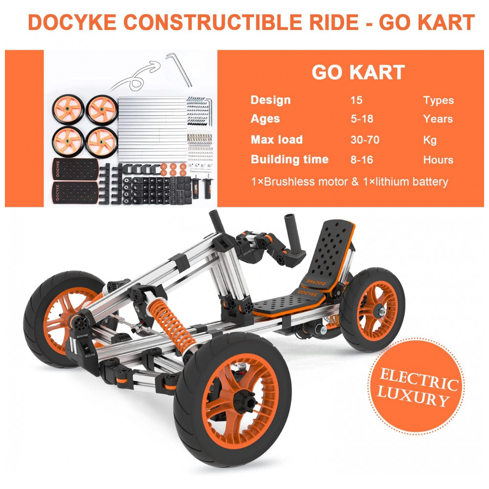 Este kit de kart é singular na série Docyke, sendo o único eletrificado. Com a capacidade de montar 15 brinquedos elétricos distintos, como kart elétrico, bicicleta elétrica, entre outros, o GK Kit vai além do entretenimento, cultivando habilidades práticas nas crianças e fortalecendo os laços familiares.