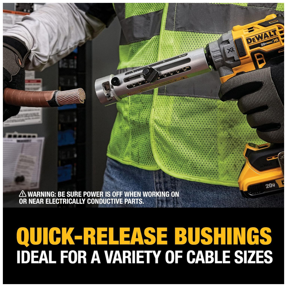 Usando a bucha apropriada, o decapador de cabos funciona em cabos de cobre e alumínio THHN, XHHW, cobrindo uma faixa de tamanho de 6 AWG a 750 MCM CU e 900 MCM AL