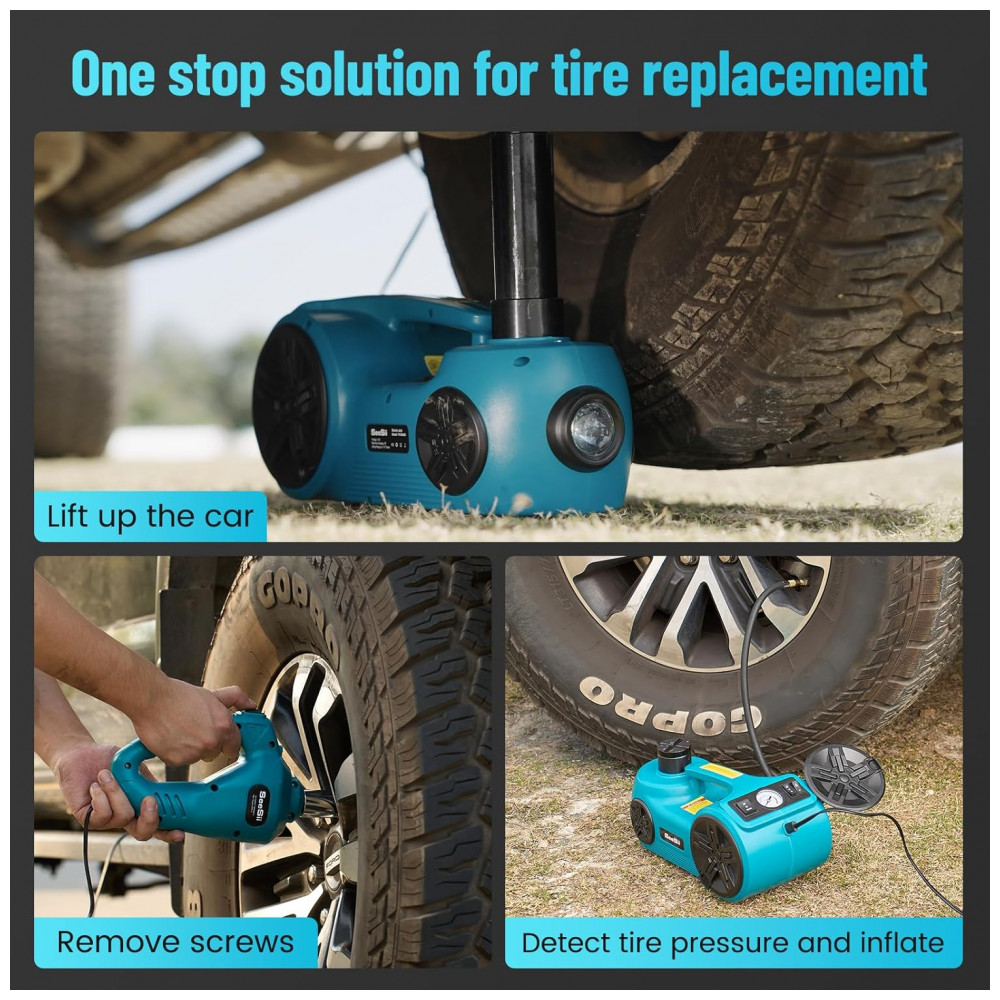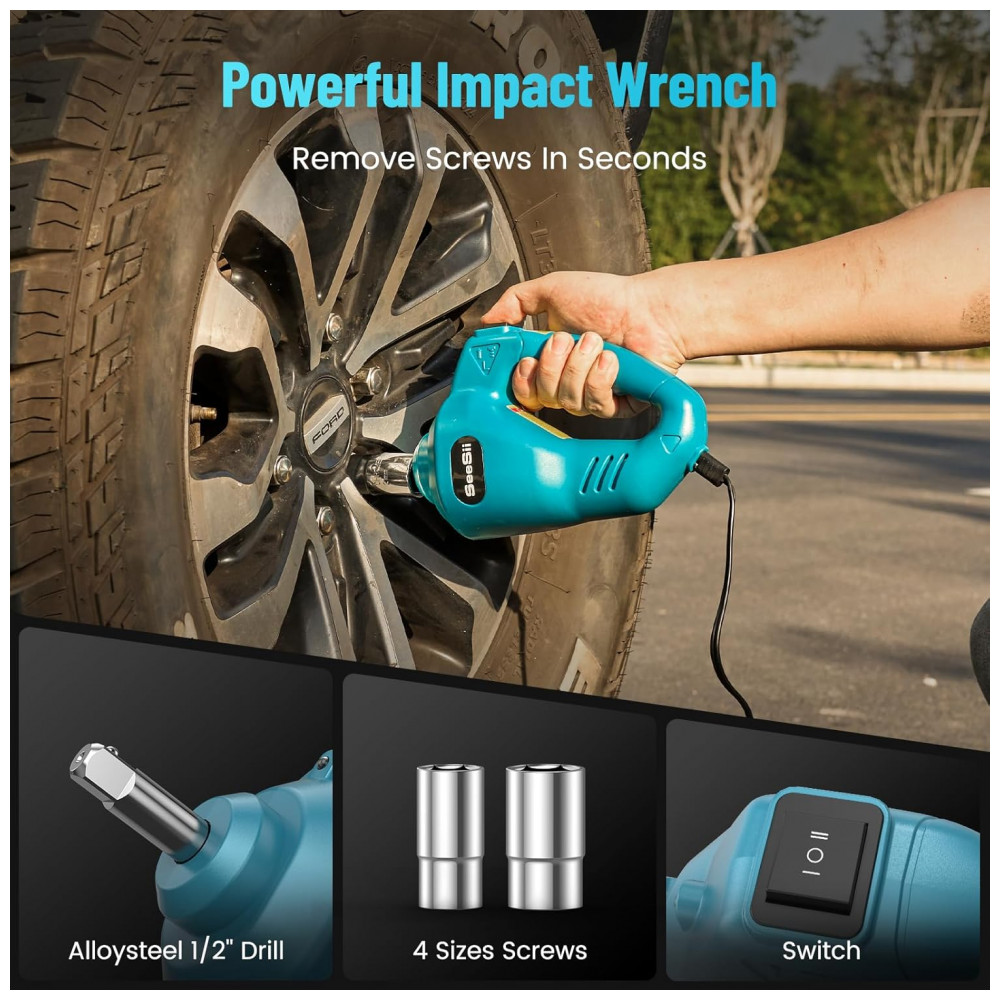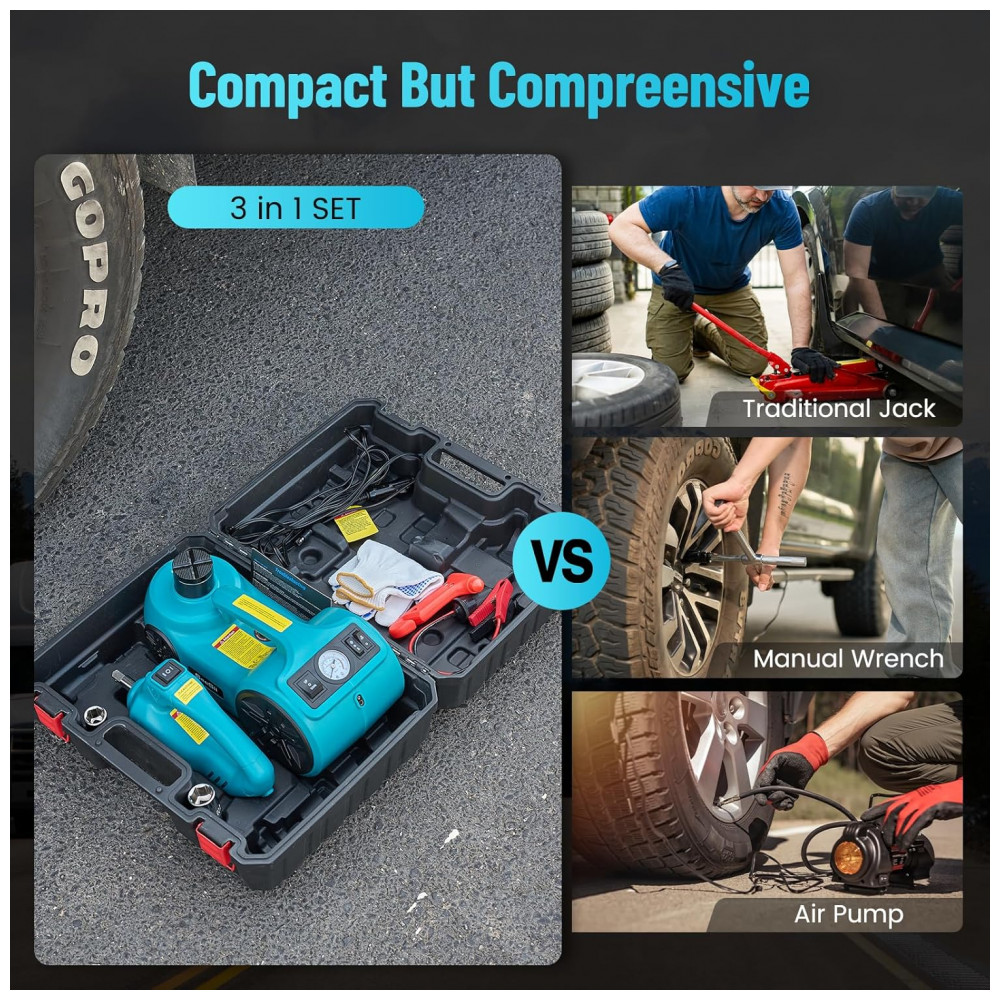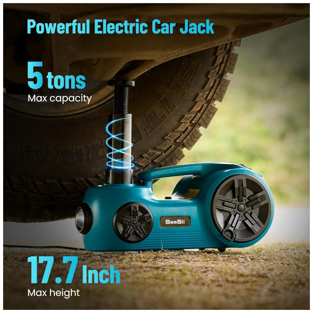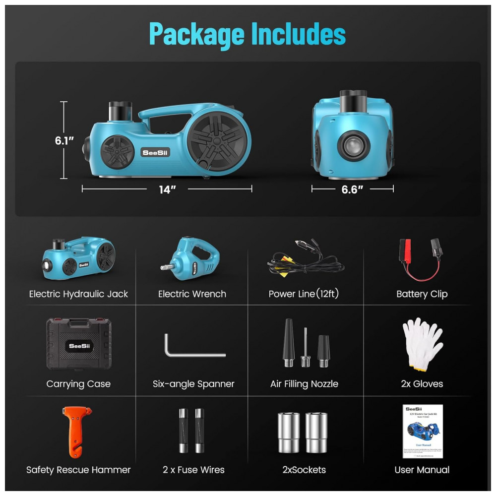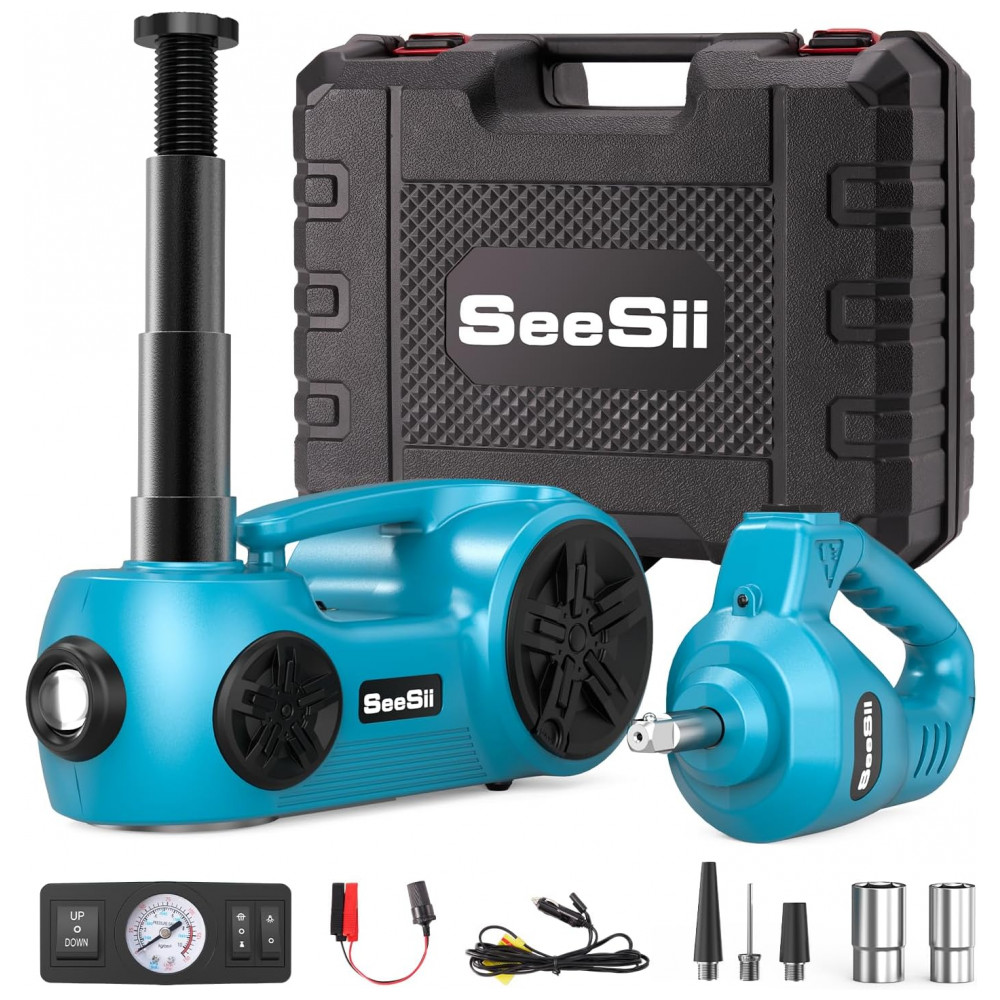 Kit Cric Elétrico SEESII 5 Toneladas 12V com Chave de Impacto Elétrica e Inflador de Pneus Alcance de Elevação de 155 a 45 cm para Troca de Pneus