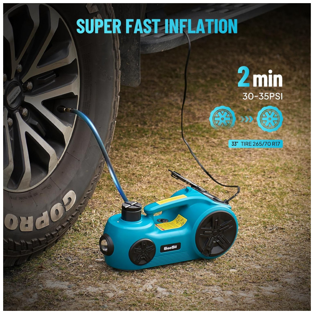 Explore a conveniência definitiva com o kit de cric elétrico hidráulico SEESII 3 em 1, que inclui uma chave de impacto elétrica e um inflador de pneus. Este kit abrangente permite que você lide com a substituição de pneus sem esforço em minutos, eliminando a dificuldade dos crics manuais tradicionais. Economize tempo e energia em emergências na estrada ou manutenção regular. Fabricado em aço de alta qualidade, o cric elétrico SEESII oferece durabilidade e confiabilidade excepcionais. Com capacidade de elevação de 5 toneladas, proporciona estabilidade para elevar com segurança sedãs, SUVs e até caminhonetes. O cric portátil eleva de 15,5 a 45 cm com facilidade. Compatível com uma variedade de veículos, desde sedãs até SUVs, veículos off-road e caminhonetes. Uma ferramenta versátil para atender à maioria de suas necessidades de elevação. Remova e instale porcas de roda em apenas 5 segundos com a potente chave de impacto incluída. Equipada com opções de soquete de dois tamanhos (17-19 mm e 21-23 mm), essa chave de impacto elétrica para manutenção de carros e caminhões lida com diferentes tamanhos de porca sem necessidade de ferramentas adicionais. Monitore e mantenha a pressão ideal dos pneus com o medidor de pressão embutido. O potente inflador restaura rapidamente pneus murchos, inflando um pneu 195/60 R14 para 38 PSI em apenas 3 minutos ou um maior 215/60 R16 em 5 minutos. Nunca mais se preocupe com a pressão baixa dos pneus durante suas viagens. Alimente o seu cric hidráulico elétrico diretamente do acendedor de cigarros do veículo ou da bateria de 12V. O cabo de energia de 3,6 metros permite posicionar convenientemente próximo às rodas dianteiras ou traseiras. Inclui fusíveis sobressalentes certificados pela TUV e UL para segurança adicional. Leve este compacto cric elétrico para emergências automotivas para onde quer que vá. Tamanho perfeito para armazenamento no porta-malas, deixando muito espaço para bagagens em viagens ou aventuras ao ar livre.