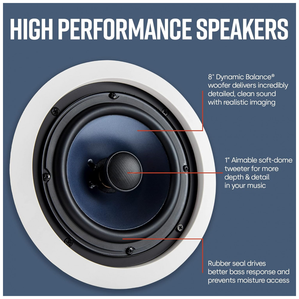 O kit Polk Audio RC80i (pack com 8 unidades) é composto por caixas acústicas de embutir no teto, de 2 vias, com formato circular e grelha branca pintável, projetadas para sistemas de som residencial e home theater com múltiplos pontos de áudio. Cada caixa utiliza um woofer de 8″ com cone em polímero mineralizado e um tweeter de 1″ orientável, oferecendo reprodução de som em faixa completa, adequada para música ambiente, canais de teto em home theater e sistemas de som distribuído.
