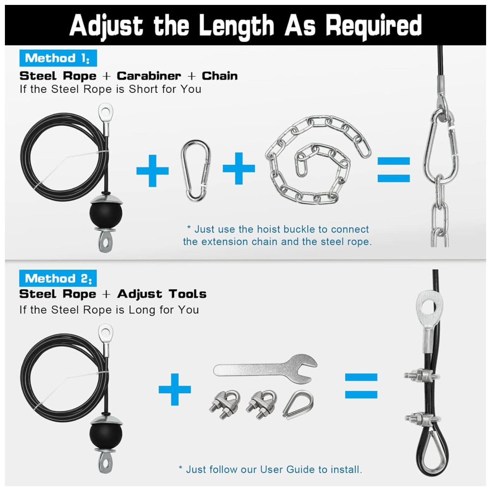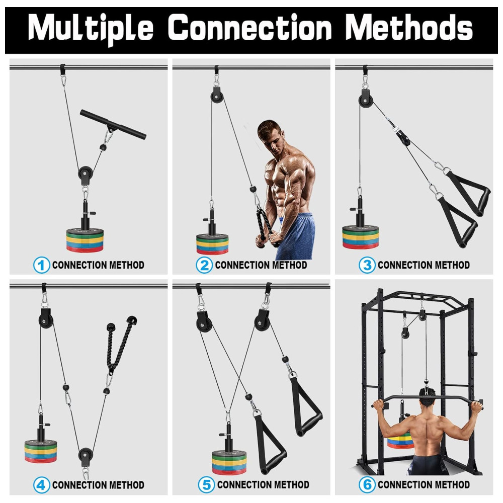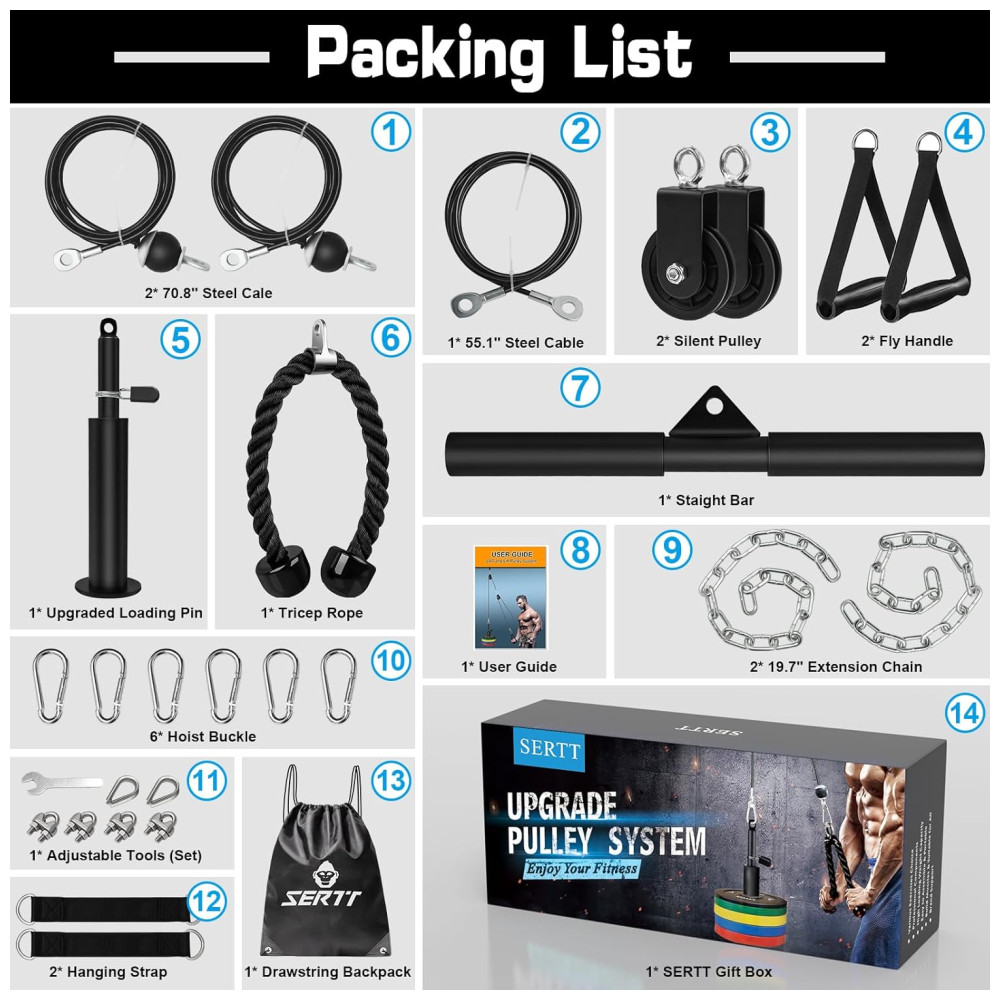 Kit de valor atualizado e mais opções de exercícios O kit SERTT Lat Pulley System tem 2 polias e mais acessórios para máquinas de cabo do que outros conjuntos de sistemas de polias de academia, permitindo que você faça DIY flexível e escolha sua própria maneira de fazer vários exercícios, como Biceps Curl, Triceps Pull Down, Lat Pull Down, Row, Fly e etc.
