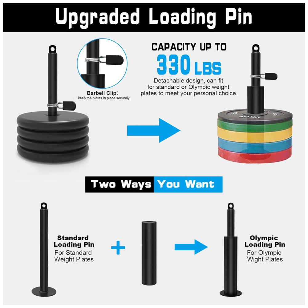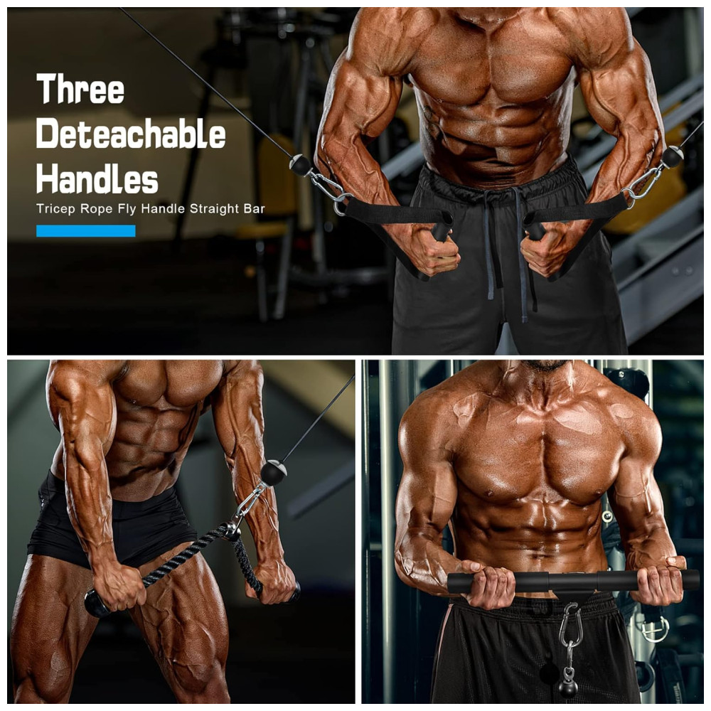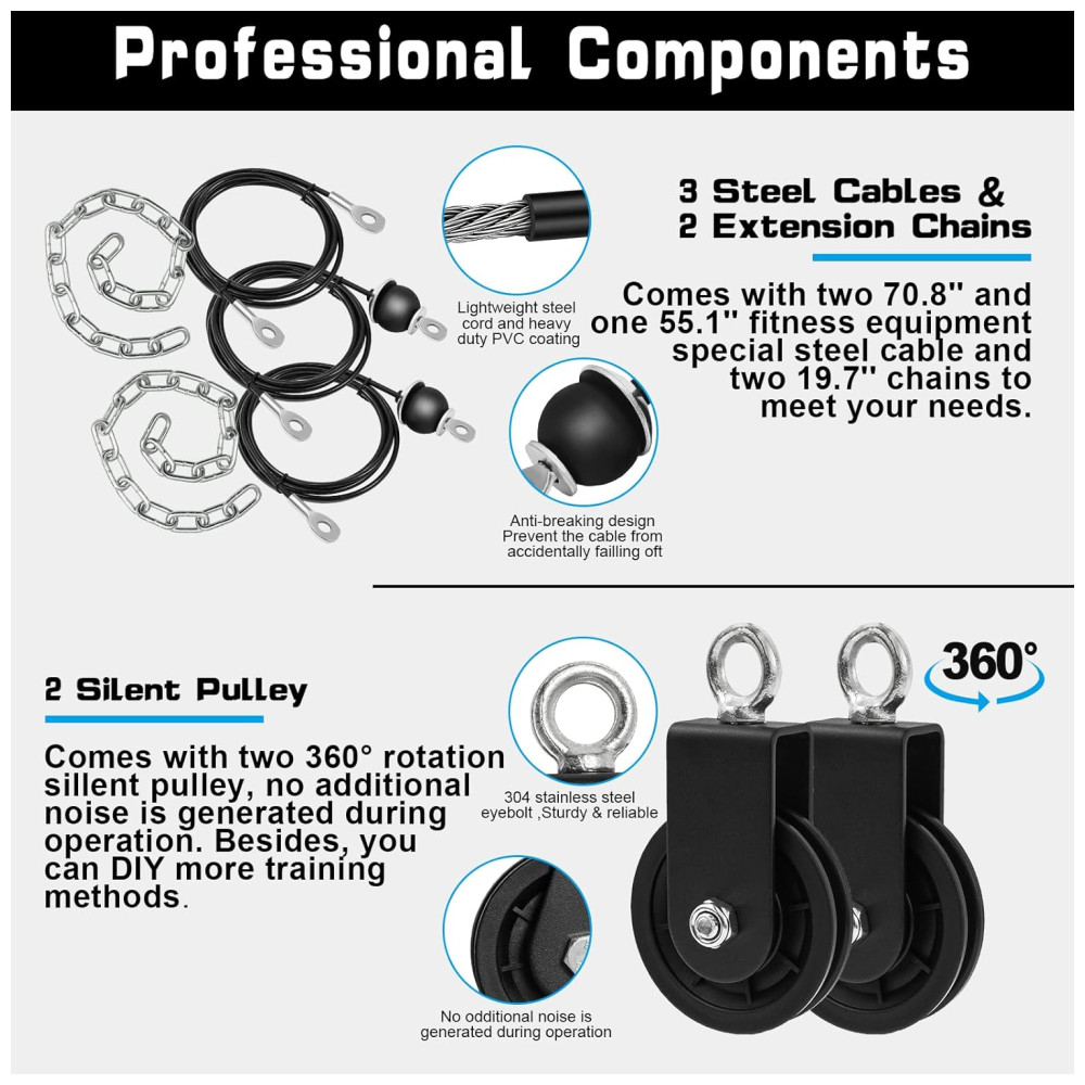 Componentes profissionais e suficientemente s Cada acessório do nosso sistema de polias de treino é cuidadosamente construído e de boa qualidade, capaz de suportar sessões diárias de exercícios intensos. Os materiais resistentes e as soldas sólidas mantêm todas as peças seguras, reduzindo qualquer chance de quebra ou deslizamento.