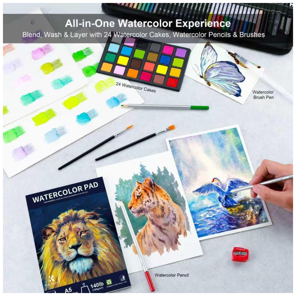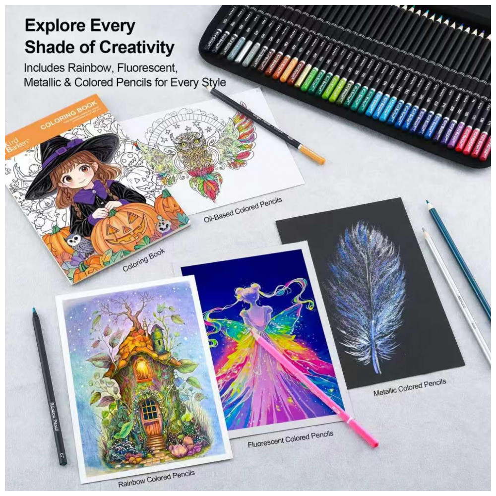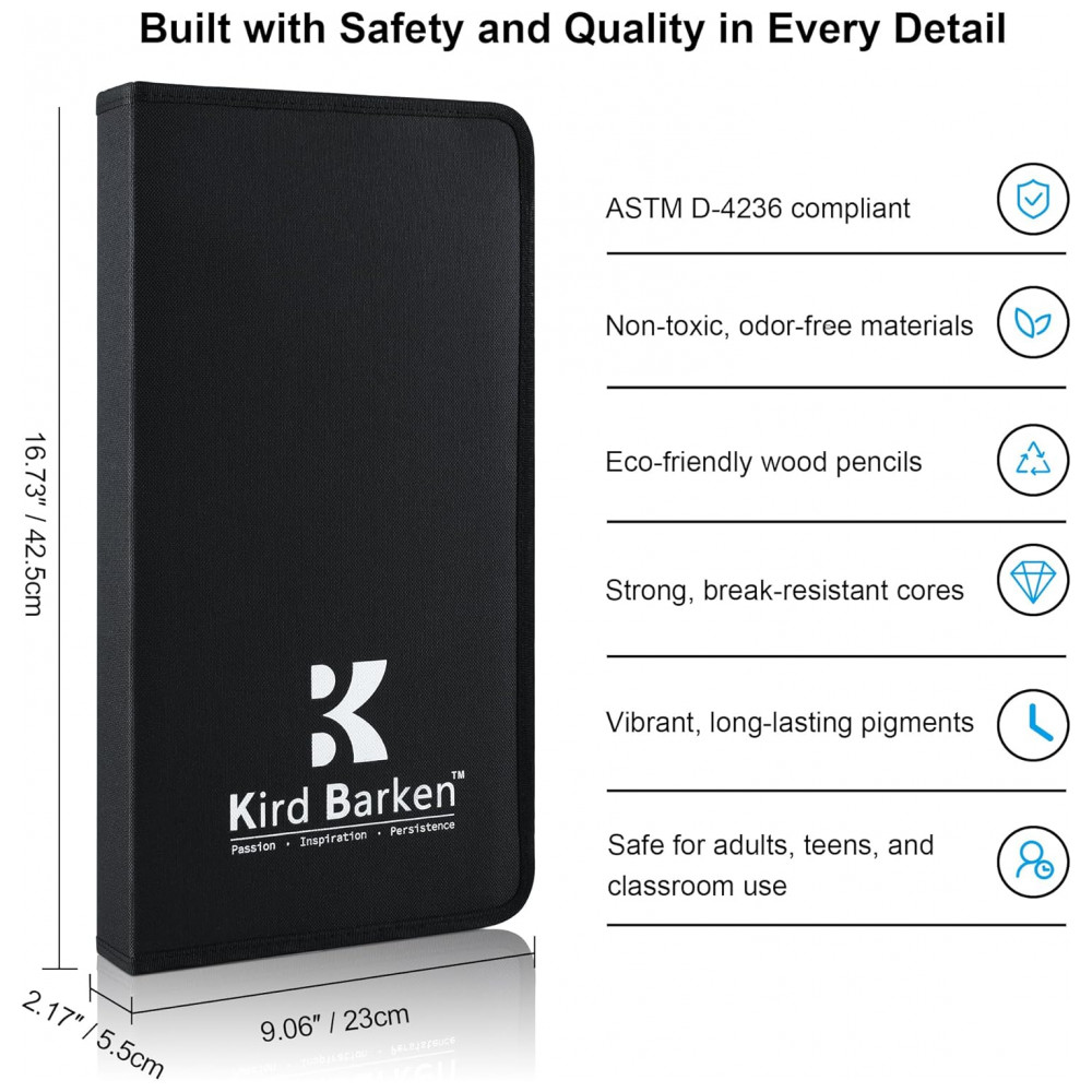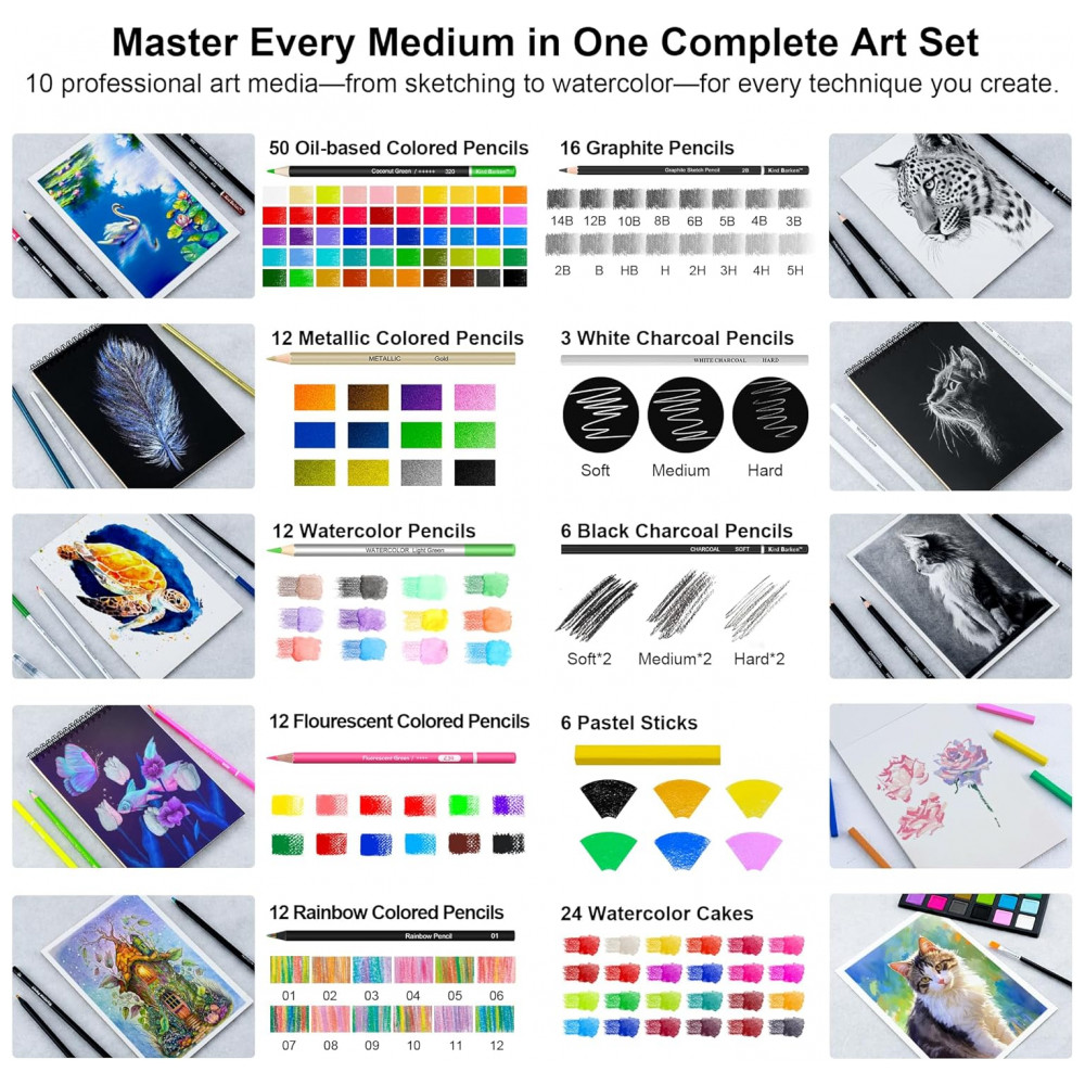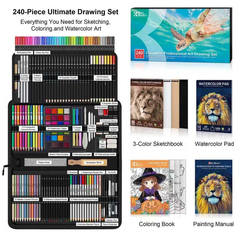 Este kit de arte Kird Barken com 240 peças reúne lápis grafite, lápis de cor, lápis aquareláveis, metálicos, fluorescentes, arco-íris e carvão, além de acessórios e blocos de papel, em um único conjunto organizado para desenho e pintura. O conjunto foi projetado para atender desde exercícios básicos de esboço até técnicas de coloração e aquarela, em nível iniciante ou mais avançado.