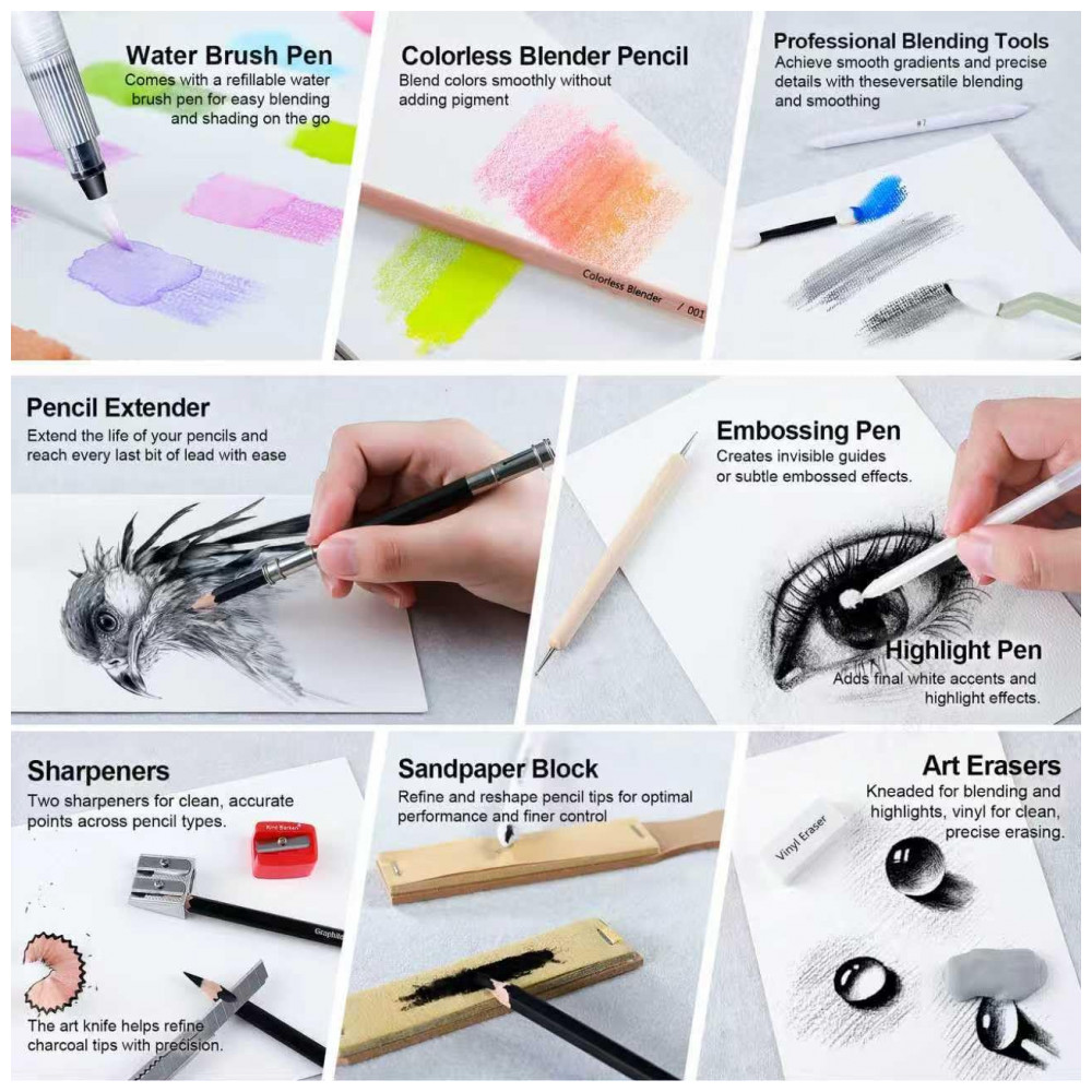 O kit inclui 16 lápis grafite em gradações de 5H a 14B, 50 lápis de cor, 12 lápis aquareláveis, 12 lápis metálicos, 12 lápis fluorescentes e 12 lápis arco-íris, além de 6 lápis de carvão preto (macio, médio e duro) e 3 lápis de carvão branco. Cada grupo de lápis oferece pigmentação uniforme para traços, sombreamento, preenchimento de áreas e efeitos de luz.