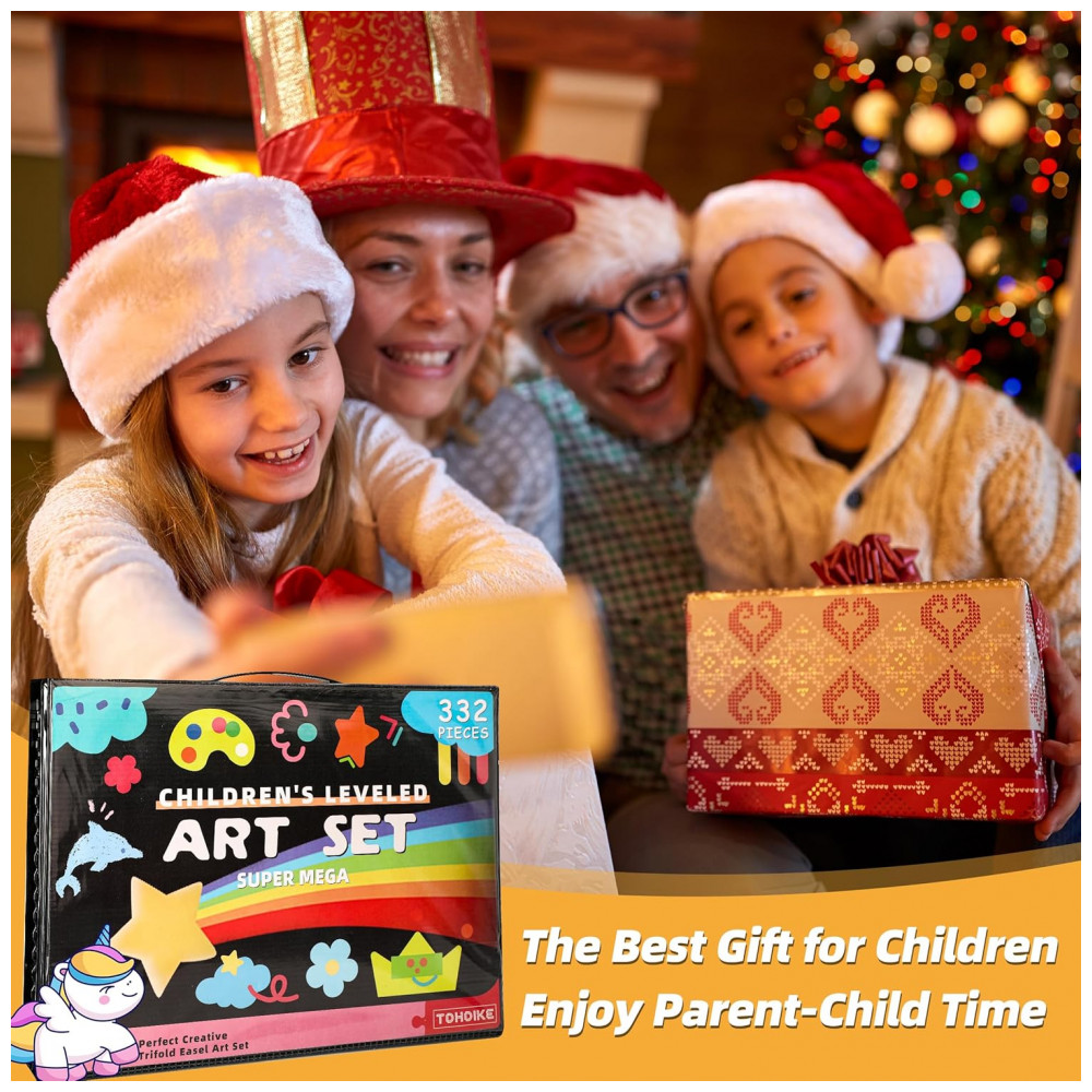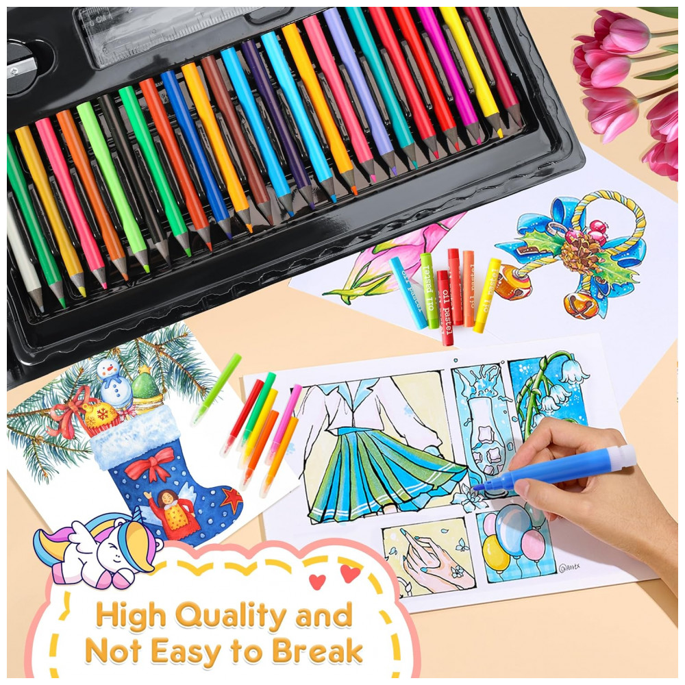 Este kit de arte TDHDIKE com 332 peças reúne materiais para desenho, colorização e pintura em um estojo rígido preto com cavalete triplo embutido, indicado para crianças em fase escolar. O conjunto inclui canetinhas, lápis de cor, giz de cera, pastéis a óleo, aquarela em pastilhas, canetas finas e acessórios básicos de desenho.