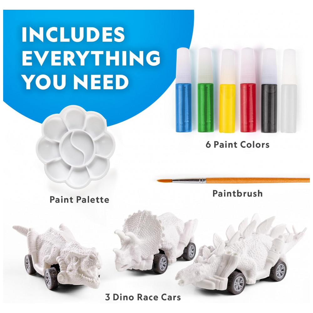 Conteúdo do kit: 10 dinossauros acrílicos, 10 ventosas para fixar na janela, 5 tintas que brilham no escuro (vermelho, amarelo, verde, laranja, azul), 2 tintas metálicas (prata, ouro), pincel, guia educativo com fatos de dinossauros