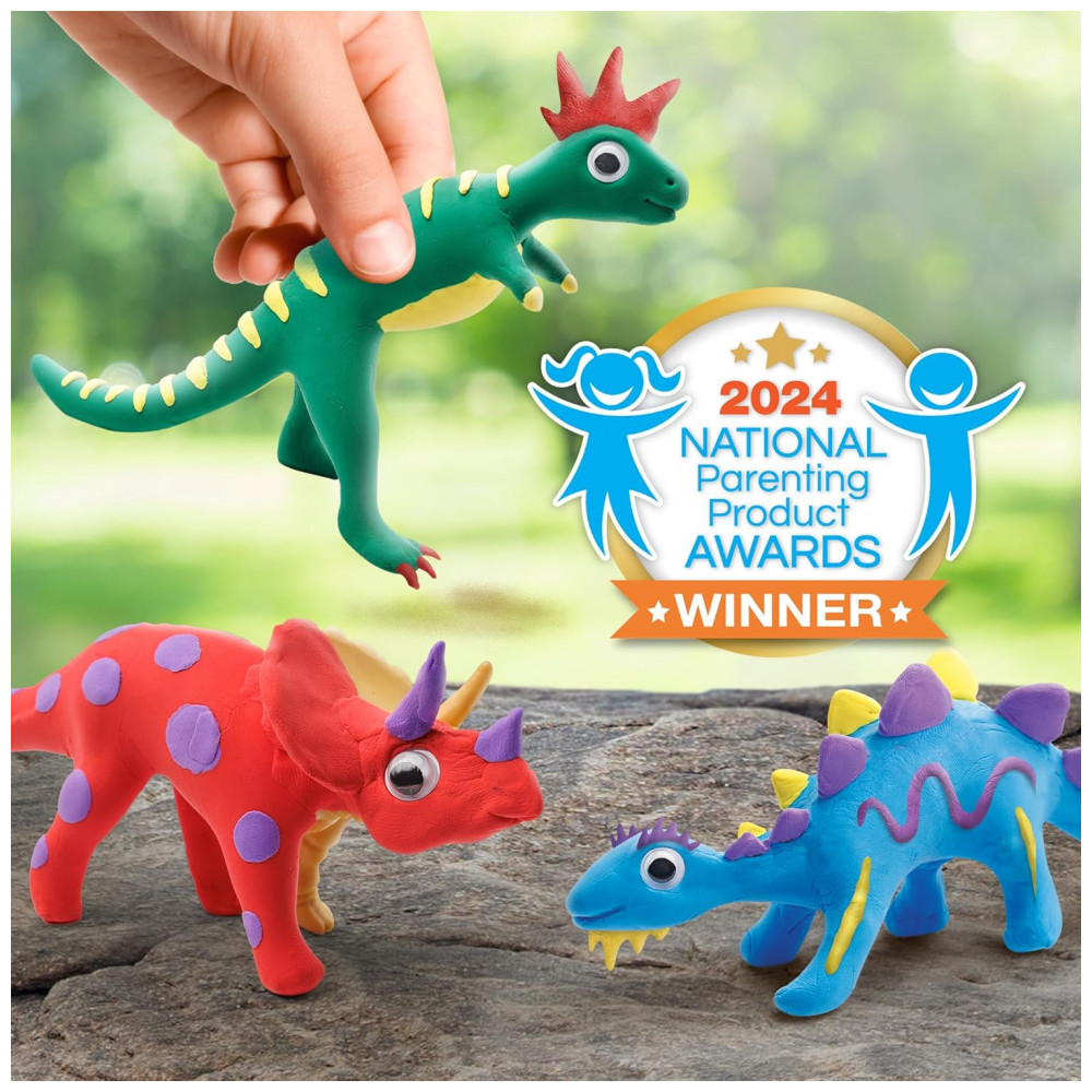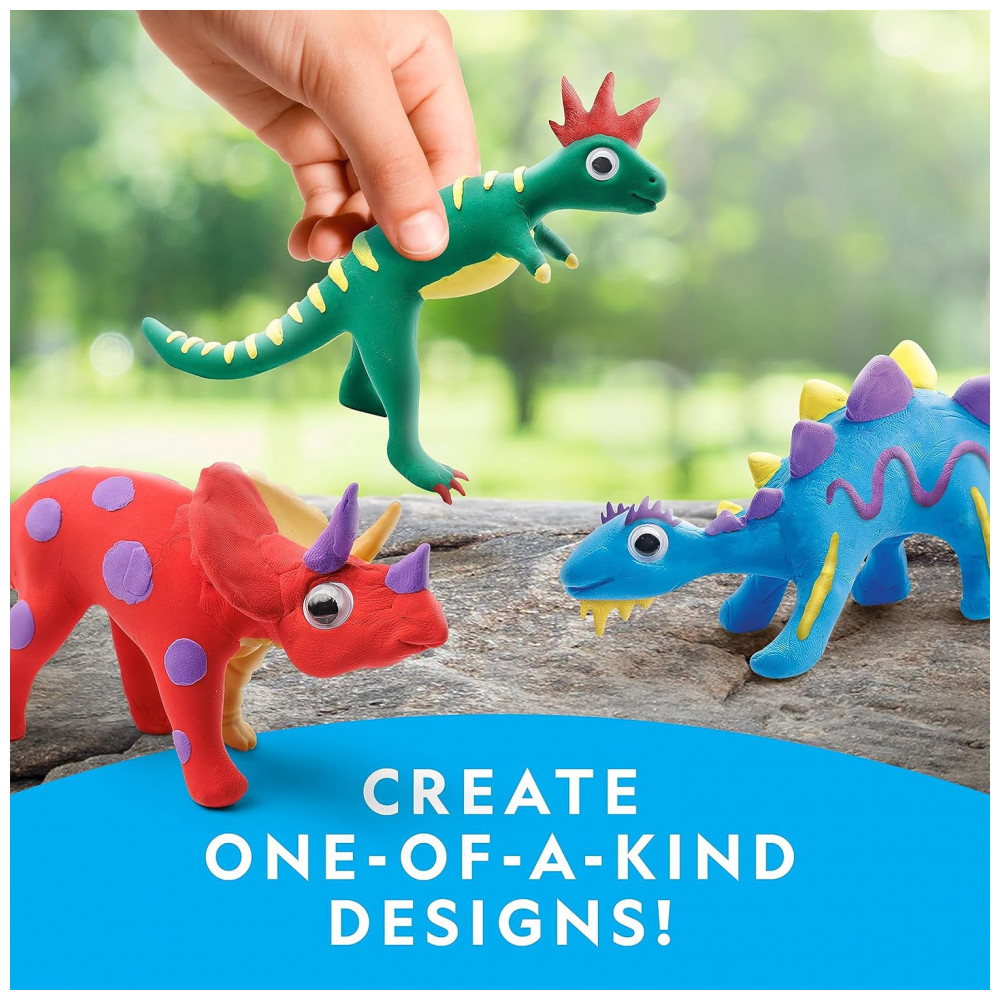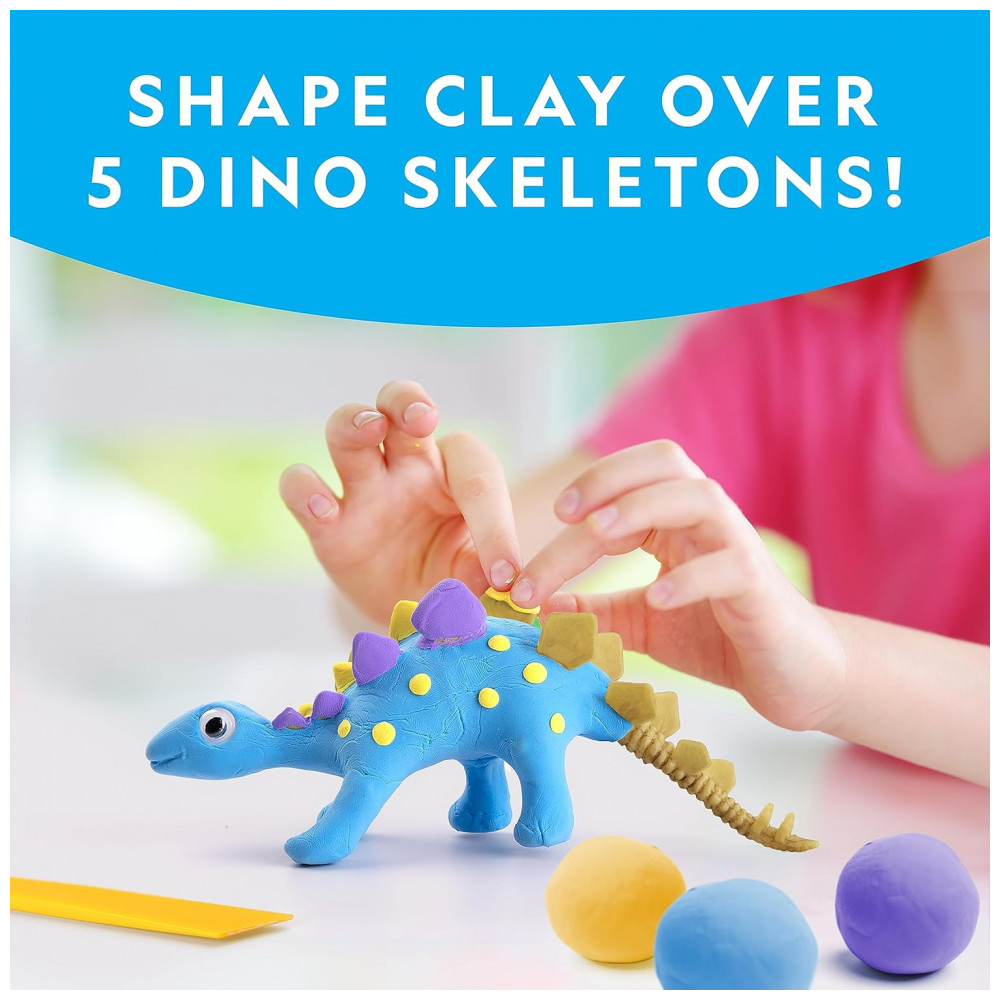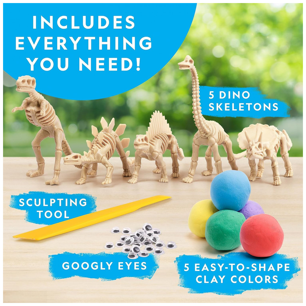 Molde argila sobre 5 Esqueletos de Dinossauros! Projete coloridas figuras de dinossauros moldando as 5 cores de argila sobre os 5 esqueletos de dinossauros: T-Rex, Estegossauro, Triceratops, Dimetrodon, Brachiossauro. Use a ferramenta de escultura e 30 olhos móveis para adicionar mais personalidade! Crie Designs Únicos! Com este kit de artesanato de argila, as crianças podem deixar fluir sua imaginação e criatividade! As 5 cores de argila são fáceis de moldar e modelar ao redor dos esqueletos de dinossauros. As crianças podem misturar e combinar cores para criar seus próprios designs divertidos! Tudo o que as Crianças Precisam! Este completo kit de artesanato de argila de secagem ao ar inclui tudo o que as crianças precisam para fazer seus próprios dinossauros únicos: 5 cores de argila de secagem ao ar (vermelha, azul, roxa, amarela, verde), 5 esqueletos de dinossauros, 30 olhos móveis e uma ferramenta de escultura. Aprenda Divertidas Curiosidades sobre Dinossauros! O Guia de Aprendizagem colorido incluído está repleto de informações sobre os cinco tipos de dinossauros incluídos no kit, bem como sobre como os cientistas utilizam fósseis para entender como os dinossauros realmente eram! Brinquedos Educativos de Alta Qualidade! Orgulhamo-nos de produzir brinquedos educativos práticos de alta qualidade, e todos os nossos produtos são apoiados por um serviço excepcional.