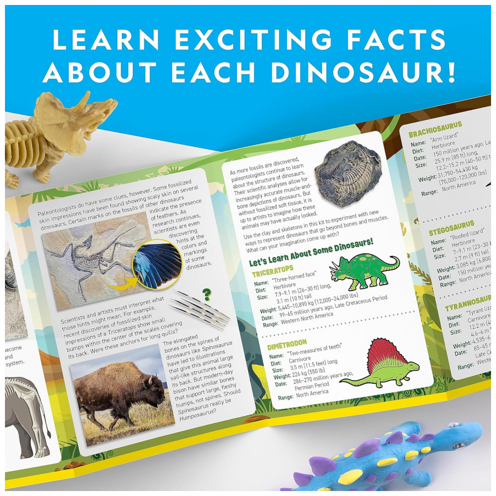 Componentes Incluídos: 5 Cores de Argila de Secagem ao Ar, Esqueletos de Dinossauros, Ferramenta de Escultura, Guia de Aprendizagem,