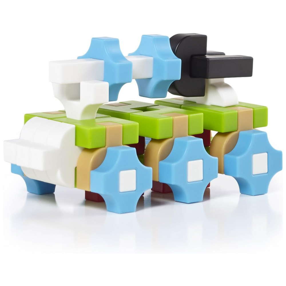 O set inclui 1000 blocos em 12 formatos diferentes, permitindo criar estruturas, personagens, animais, veículos e outros modelos em atividades individuais ou em grupo. Acompanha também 20 cartões de criatividade frente e verso com sugestões de montagem e um contêiner plástico grande para armazenamento organizado no ambiente escolar ou em casa. O brinquedo é compatível com outros conjuntos IO Blocks, ampliando possibilidades de combinação entre kits.