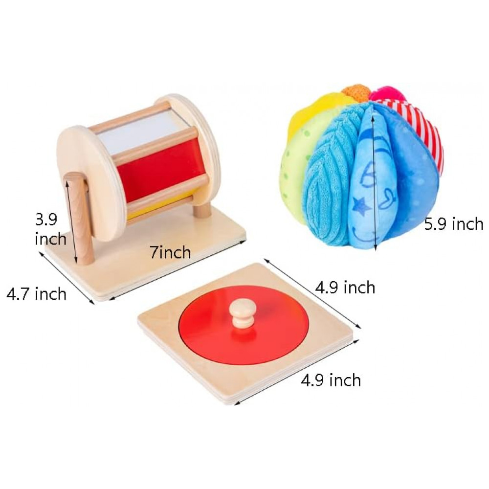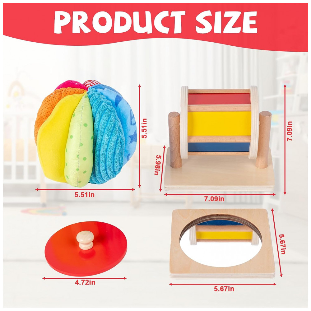 O kit de jogo inclui um quebra cabeça de botão de espelho vermelho, um tambor giratório médio e uma bola de tecido arco íris.