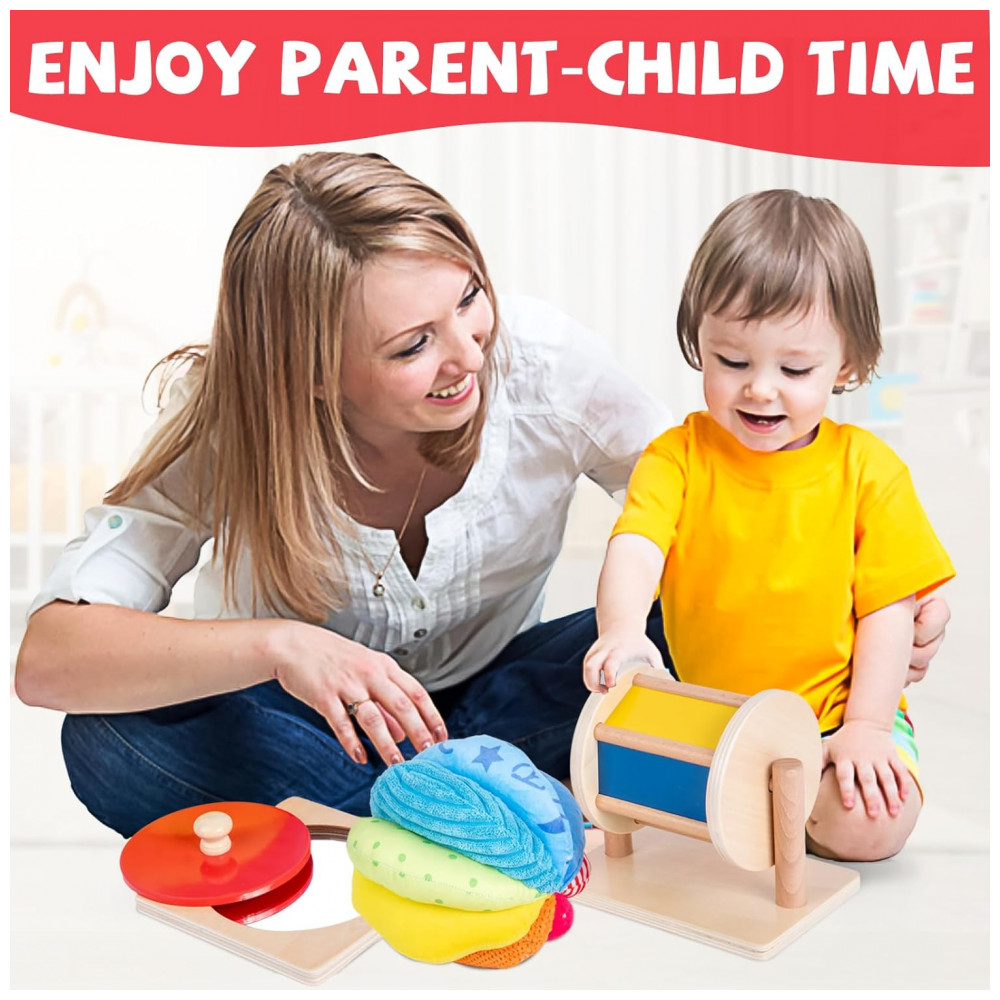 O Tambor Giratório Médio Montessori é perfeito para ajudar a fortalecer os músculos centrais dos bebês que ainda estão aprendendo a sentar sem ajuda. Ao observar seu bebê brincar, você poderá vê lo coordenando as mãos para girar o tambor, melhorando a coordenação olho mão. O espelho é uma função adicional, retendo a atenção do seu filho por mais tempo