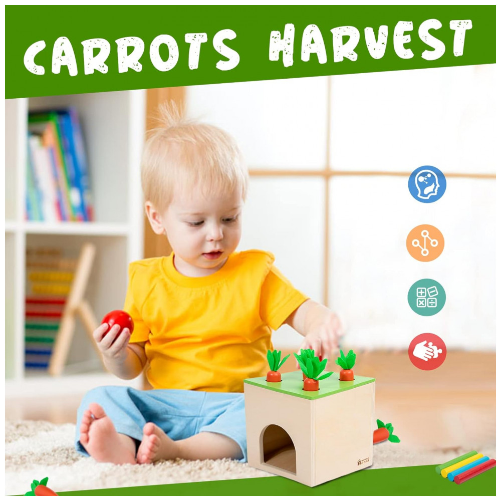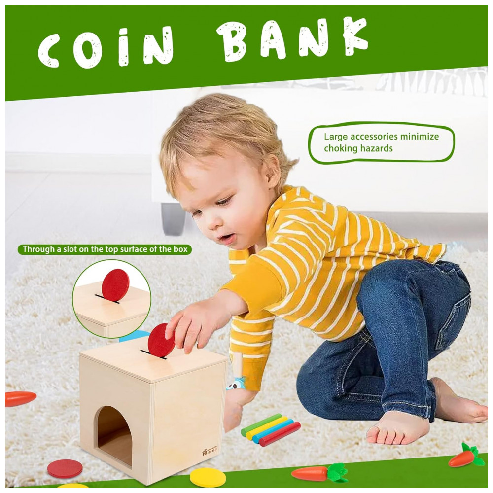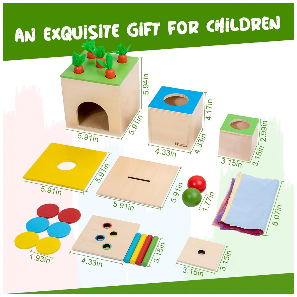 O Kit de Brinquedo Montessori 6 em 1 inclui a Caixa de Permanência de Objetos, Caixa de Moedas Montessori, Brinquedo de Colheita de Cenouras, Jogo de Empilhamento de Caixas, Jogo de Papel e Jogo de Combinação de Palitos. É uma excelente escolha para pais que desejam proporcionar aos seus bebês um conjunto divertido e envolvente. Com seis maneiras diferentes de brincar, este conjunto de brinquedos manterá seu bebê entretido e envolvido por horas a fio.