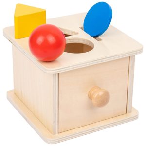 Este é um brinquedo de madeira simples que pode ajudar seu bebê a aprender mais sobre a persistência dos objetos. Tem 3 furos na parte superior e uma gaveta. Tem um triângulo, 6 moedas redondas e uma bola de madeira vermelha.