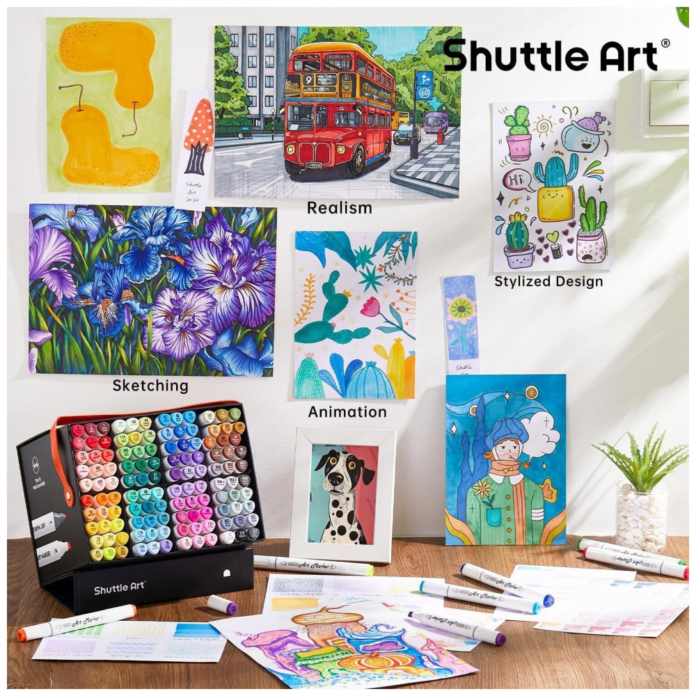 FÁCIL DE MISTURAR TINTA E FORMA TRIANGULAR Os marcadores de ponta dupla Shuttle Art misturam se e estratificam se bem sem deixar riscos para trás e secar rapidamente. Misturar cores é muito fácil, colocando uma cor única em outra, criando uma paleta de cores ilimitada. O barril em forma de quadrilátero ergonômico exclusivo pode ser deslizado com facilidade e conforto. A forma única também evita que os marcadores saiam de superfícies lisas.