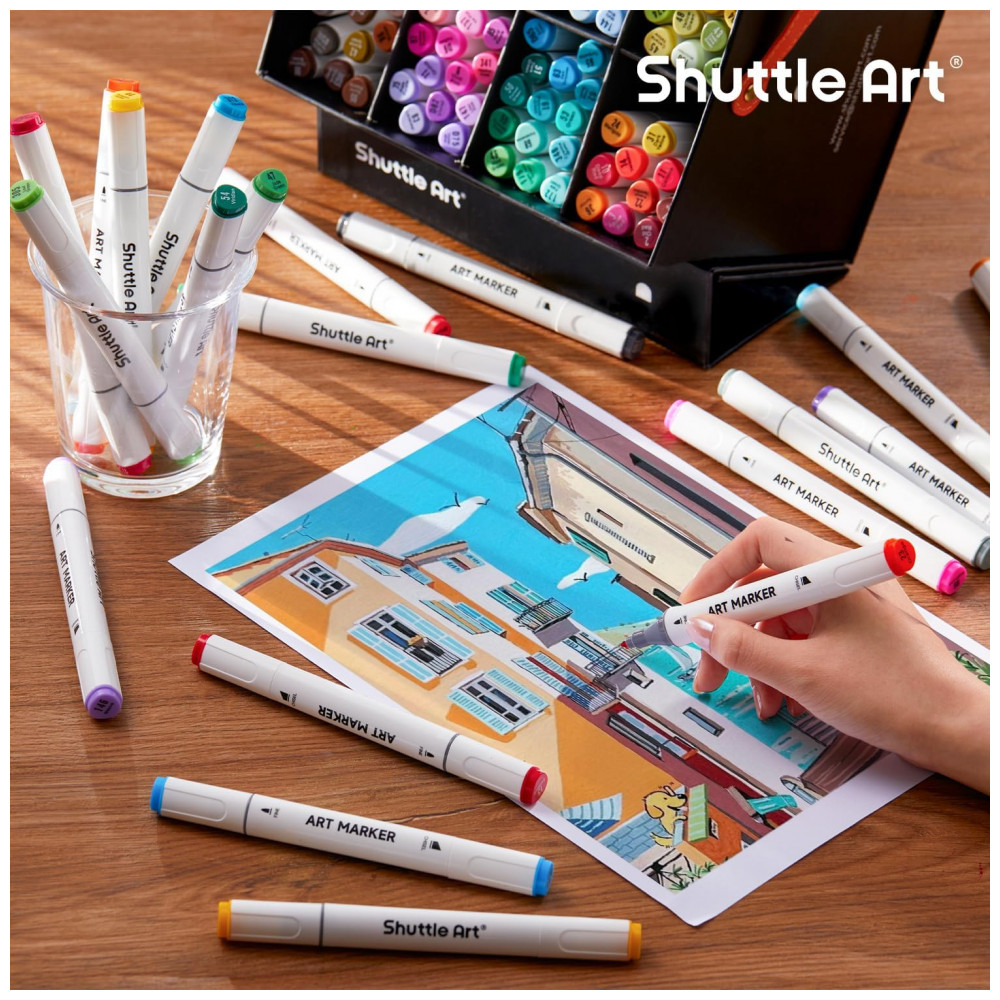 PONTA DUPLA Os marcadores permanentes à base de álcool de ponta dupla Shuttle Art têm uma ponta larga de para cobertura rápida e uma ponta de bala pontiaguda de para destaques, sombras, esboços e escrita em geral. Nossos marcadores escrevem bem e se misturam facilmente, são classificados para 300 metros de uso contínuo, o que fornece uma grande quantidade de tinta por marcador.