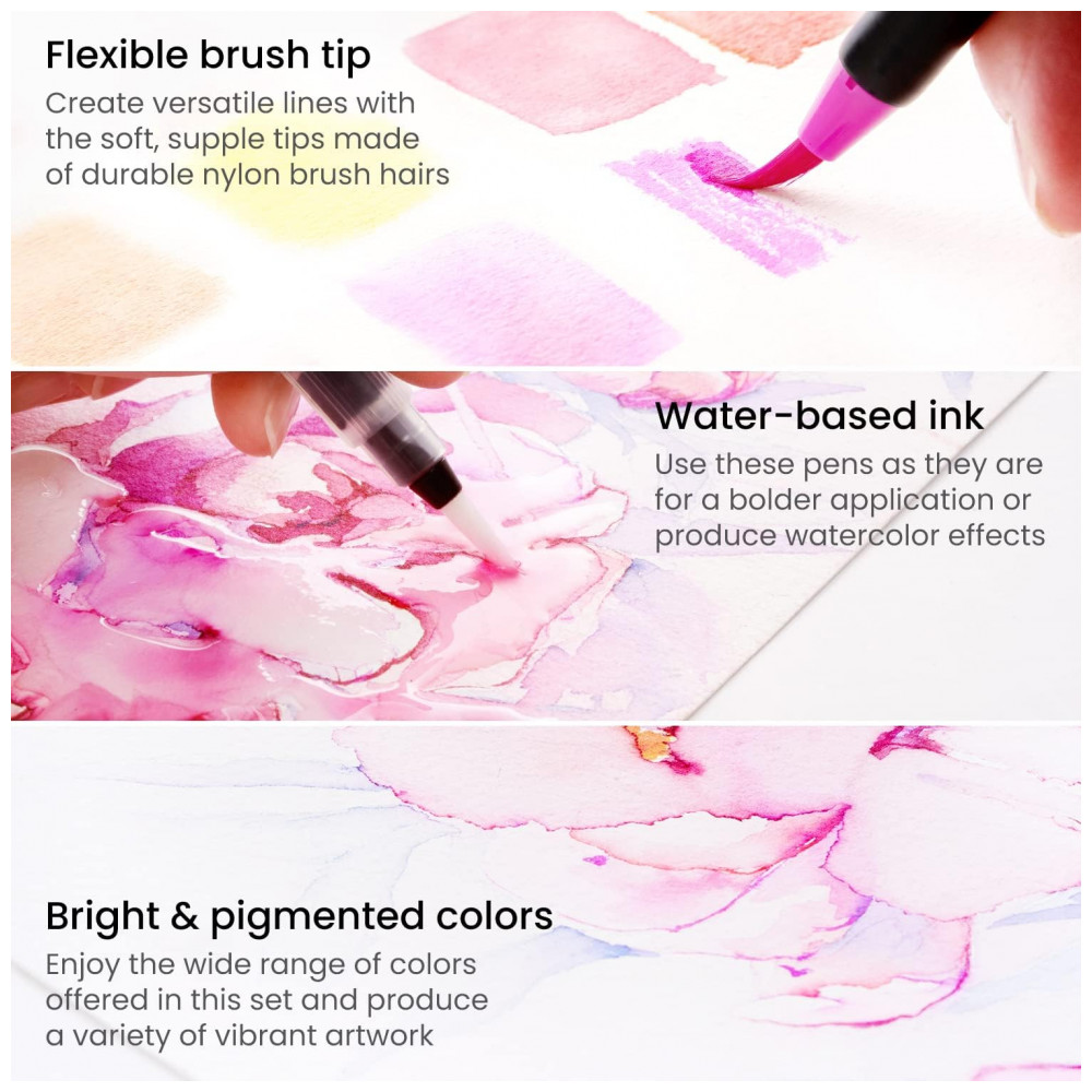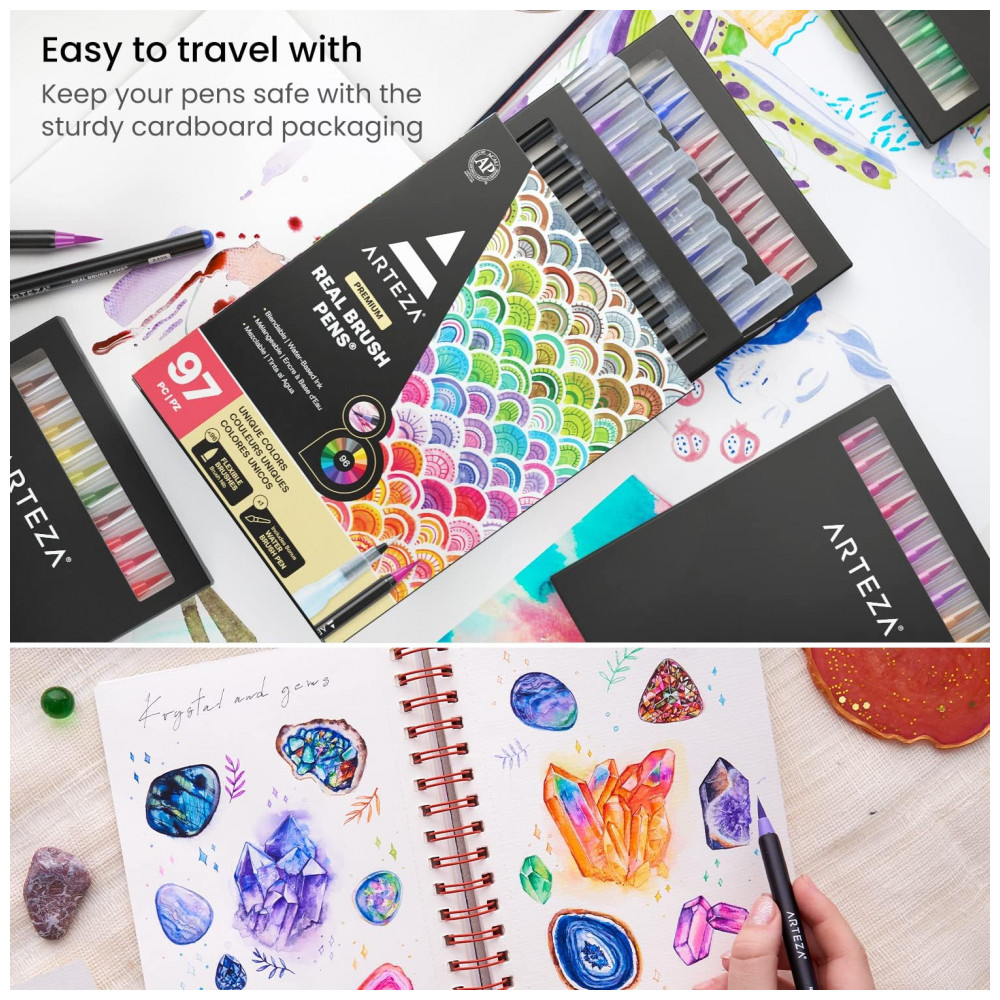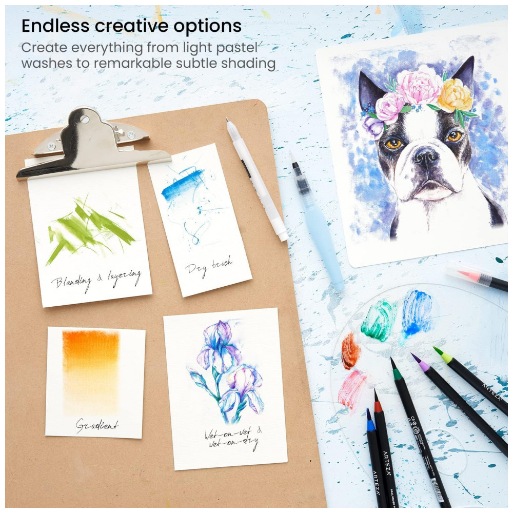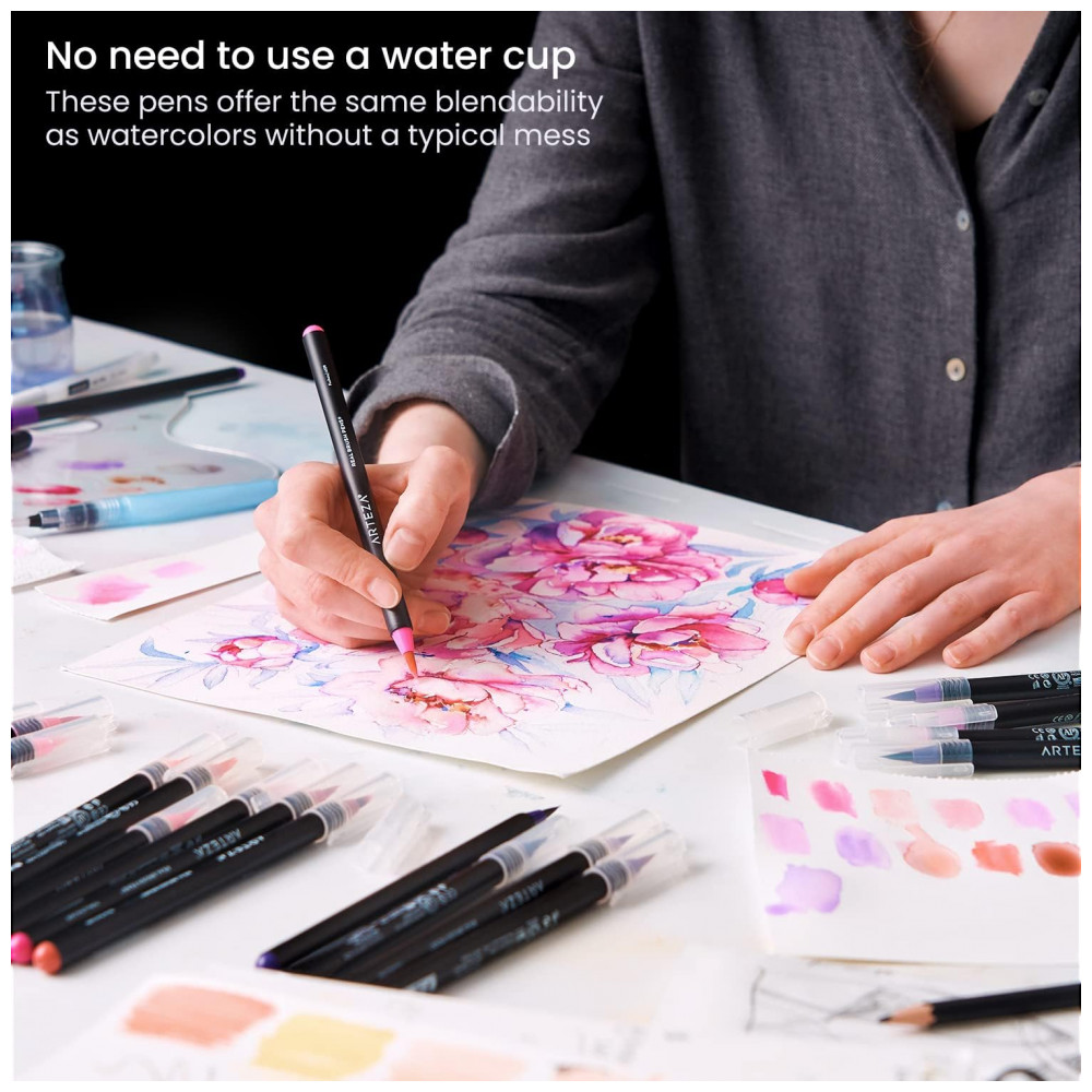 Opções criativas infinitas use suas canetas Arteza Paint Brush com água para criar delicados efeitos de aquarela. Ou use sem água para pintura a seco, esboços, coloração, caligrafia e muito mais.