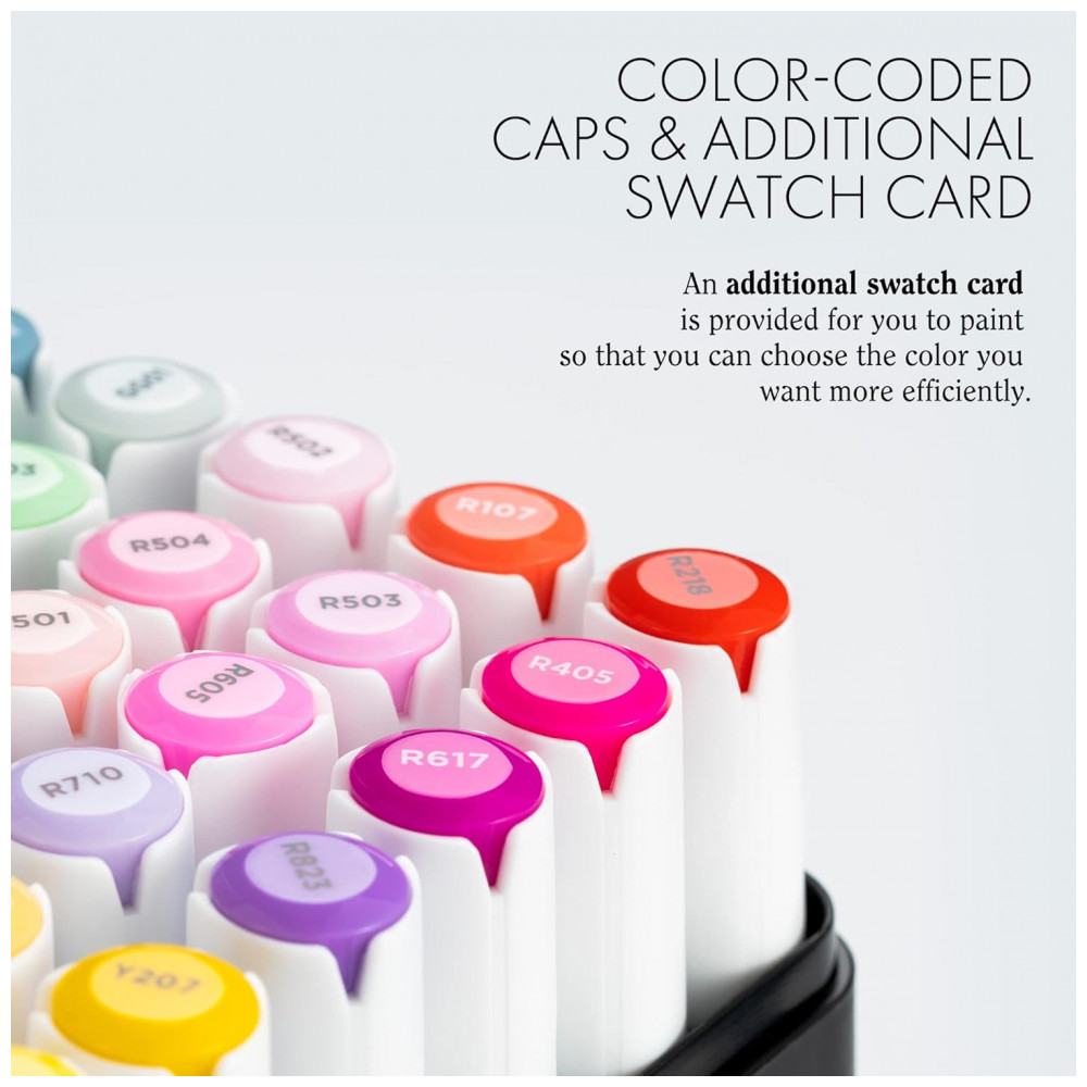 CAIXA DE TRANSPORTE CONVENIENTE Uma caixa de transporte de plástico transparente com uma alça dobrável facilita a viagem e o zenamento. Zonas de marcador e tampas codificadas por cores ajudam você a agrupar o caminho certo durante o desenho, em vez de ficar enterrado em uma pilha de marcadores