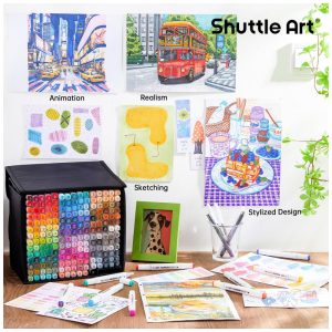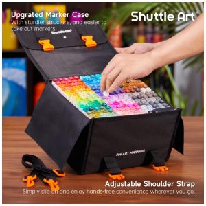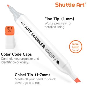 PONTA DUPLA Os marcadores permanentes à base de álcool de ponta dupla Shuttle Art têm uma ponta larga de para cobertura rápida e uma ponta de bala pontiaguda de para destaques, sombras, esboços e escrita em geral. Nossos marcadores escrevem bem e se misturam facilmente. Eles são classificados para 300 metros de uso contínuo, o que fornece uma grande quantidade de tinta por marcador.