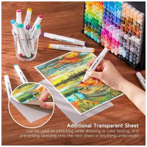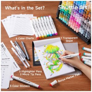 205 CORES ACESSÓRIOS 204 marcadores permanentes vibrantes 1 liquidificador incolor 1 bloco de marcadores 1 estojo de zenamento 1 cartela de cores. Nosso bloco de marcadores tem uma superfície lisa que pode evitar sangramento, manchas e enevoamento para o seu trabalho artístico, estojo preto com zíper é perfeito para zenamento e viagens, tabelas de cores podem registrar sua coleção de cores em um só lugar. Mais acessórios com preço mais barato
