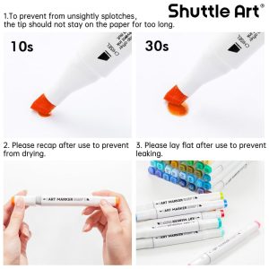 CUIDADOS O conjunto de marcadores é atóxico e livre de ácido, para crianças e estudantes, em conformidade com ASTM D4236. Para evitar o sangramento da tinta durante o uso, a ponta não deve permanecer no papel por muito tempo. Os marcadores precisam escrever em um papel de marca específico para que não escorra para a próxima camada. Para evitar que o marcador seque e vaze a tinta, recapitule e mantenha o marcador na horizontal após o uso