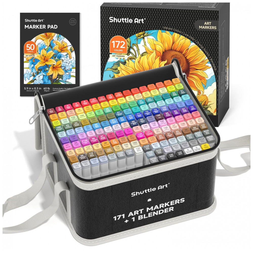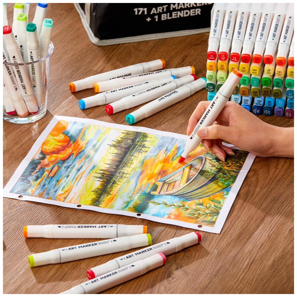 172 CORES ACESSÓRIOS 171 marcadores permanentes vibrantes 1 liquidificador incolor 1 bloco de marcadores 1 estojo de zenamento 1 cartela de cores. Nosso bloco de marcadores tem uma superfície lisa que pode evitar sangramento, manchas e enevoamento para o seu trabalho artístico, estojo preto com zíper é perfeito para zenamento e viagens, tabelas de cores podem registrar sua coleção de cores em um só lugar. Mais acessórios com preço mais barato