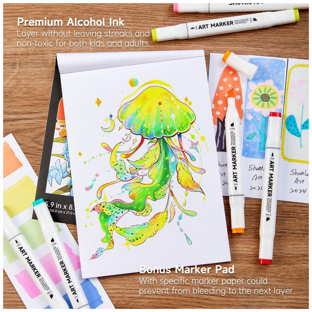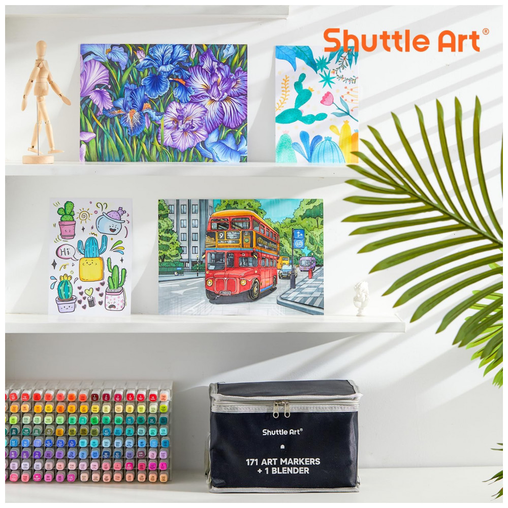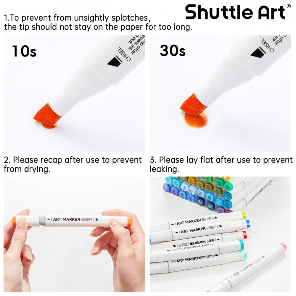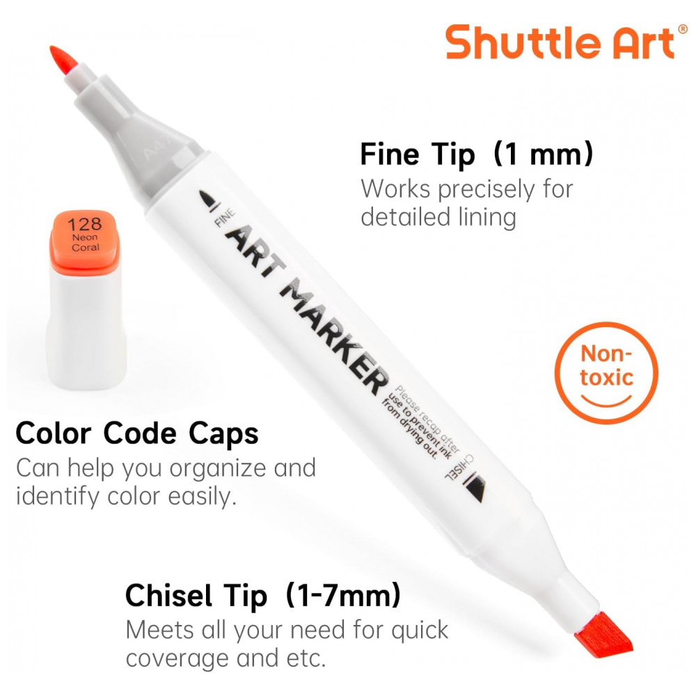PONTA DUPLA Os marcadores permanentes à base de álcool de ponta dupla Shuttle Art têm uma ponta larga de para cobertura rápida e uma ponta de bala pontiaguda de para destaques, sombras, esboços e escrita em geral. Nossos marcadores escrevem bem e se misturam facilmente. Eles são classificados para 300 metros de uso contínuo, o que fornece uma grande quantidade de tinta por marcador.