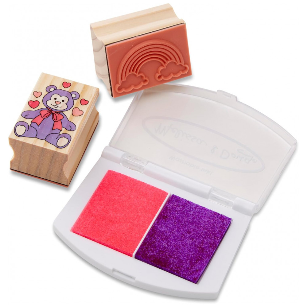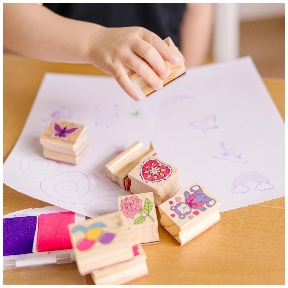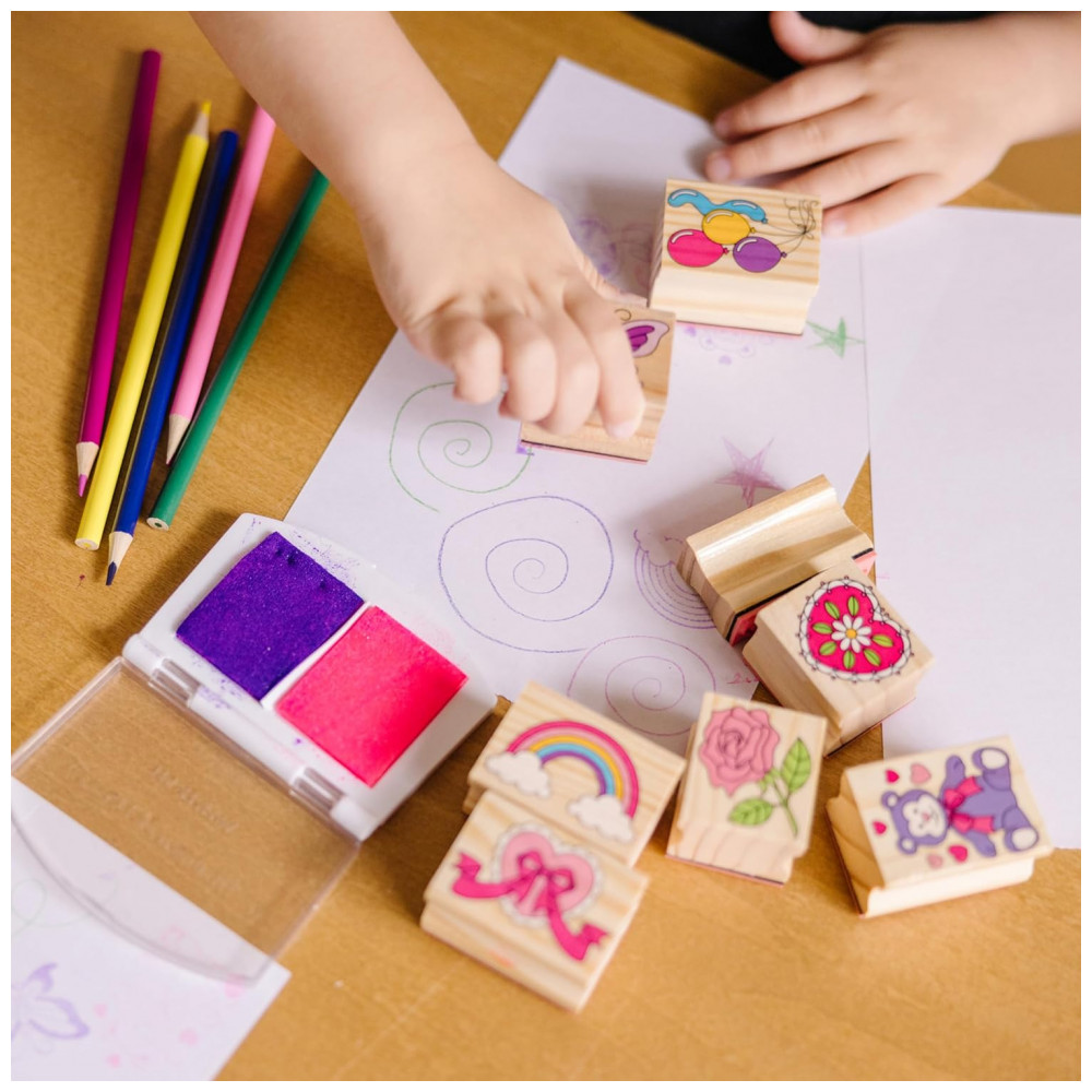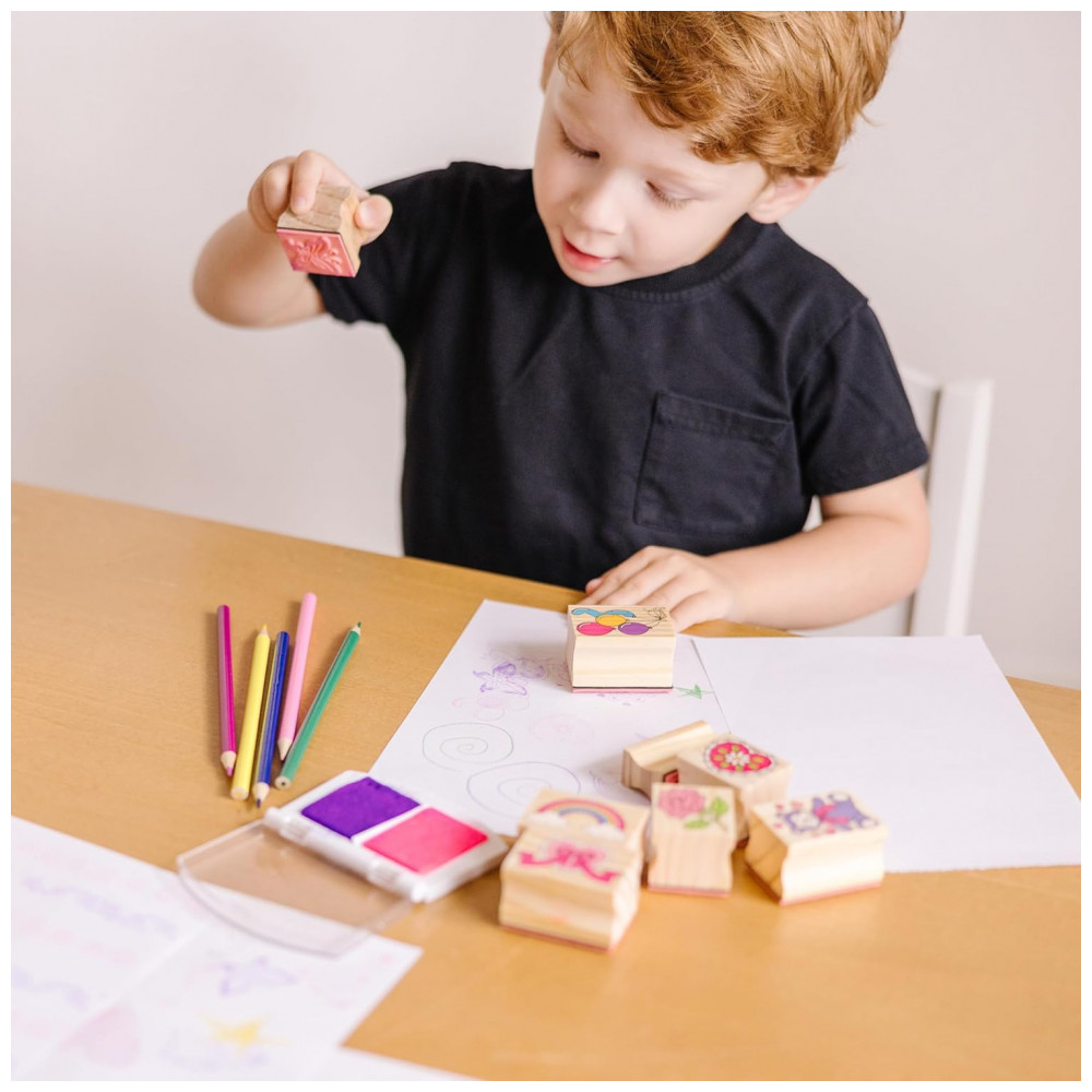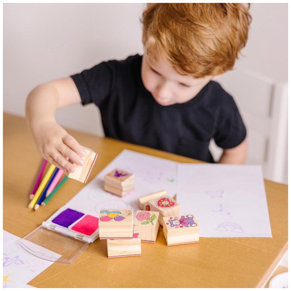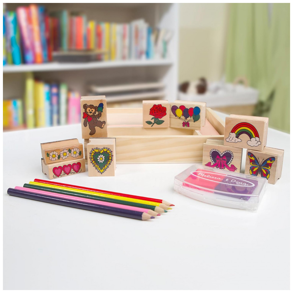 Kit de Carimbos Infantil de Madeira com 9 Selos 5 Lápis de Cor e Bloco de Carimbo de 2 Cores Melissa & Doug