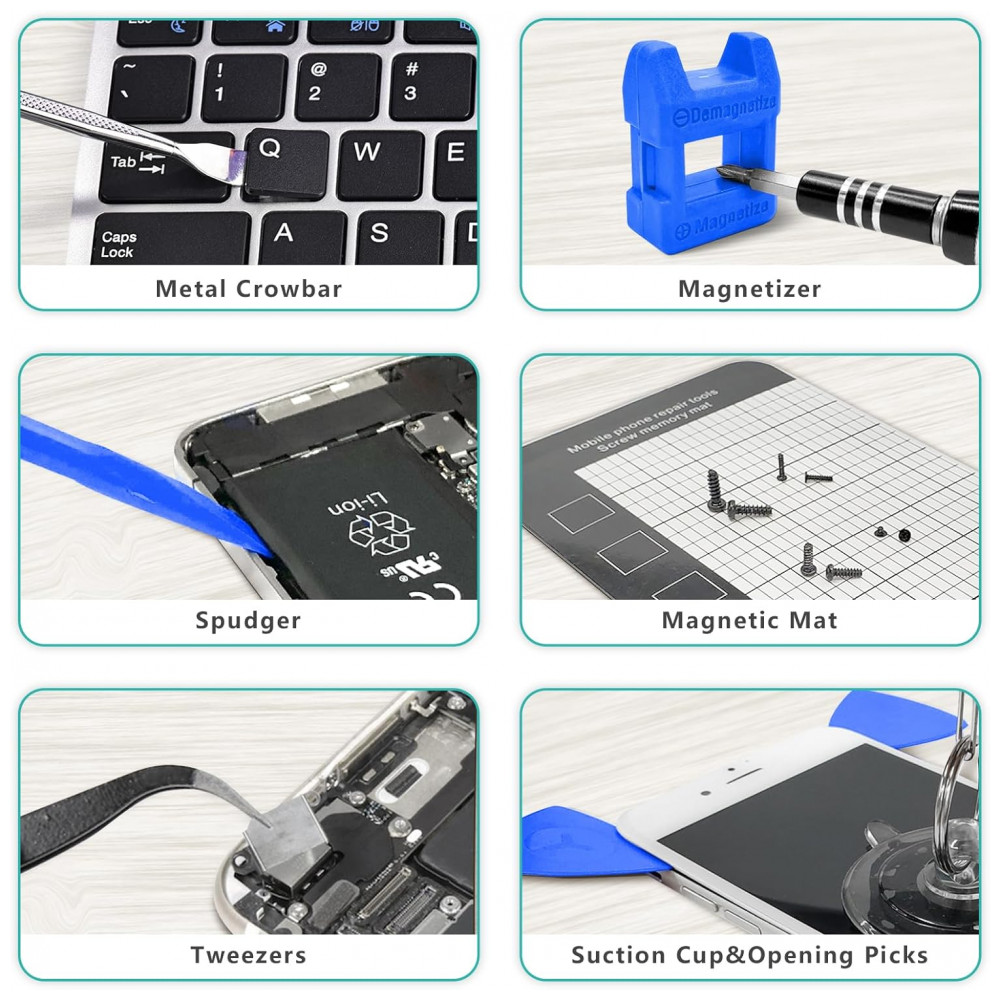 • Conteúdo da caixa: 120 bits CR-V, 1 cabo azul ergonômico, 1 haste extensão, 1 haste flexível, 1 magnetizador azul, 2 pry bars curtas duplas, 1 pry bar metal dupla, 6 lâminas pry finas plásticas azuis, 1 pinça curva preta, 1 lâmina pry flexível metal, 1 pry bar plástica pontiaguda azul, 1 pry bar carbono preta, 1 ventosa, 1 ejetor SIM, 1 tapete magnético, 1 escova limpeza, case nylon