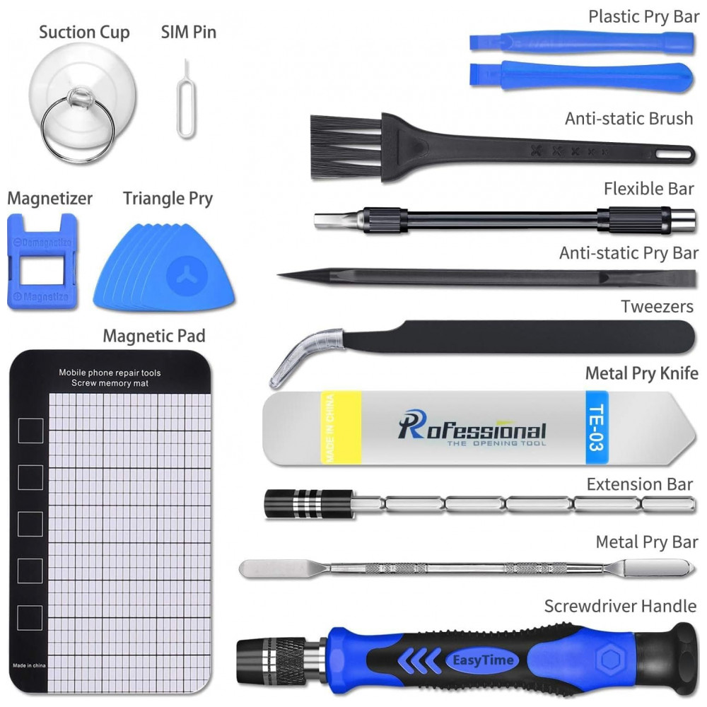 Kit de chaves de fenda de precisão EasyTime com 140 peças, incluindo 120 bits CR-V para reparos em computadores, laptops, smartphones, tablets, MacBook, iPhone, Xbox e eletrodomésticos. Ferramentas complementares como barras pry múltiplas, spudgers, haste flexível, magnetizador azul, pinça curva, ventosa, ejetor SIM e tapete magnético suportam abertura de capas de controllers, remoção de telas e upgrades de hardware em manutenções técnicas.