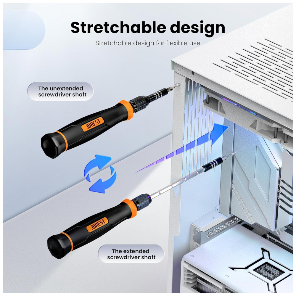 Kit de chaves de fenda de precisão JOREST com 152 peças, incluindo 140 bits H4x28 mm e 4 bits longos H4x48 mm em formatos Torx, Phillips, pentalobe, star, triwing e triangle, para reparos em eletrônicos, laptops, consoles e acessórios. Inclui extensão ajustável, eixo flexível, magnetizador/demagnetizador, tapete magnético e adaptador 1/4″ para 4 mm, facilitando desmontagens em ângulos variados e locais profundos. Caixa organizada com slots magnéticos mantém bits identificados por modelo.