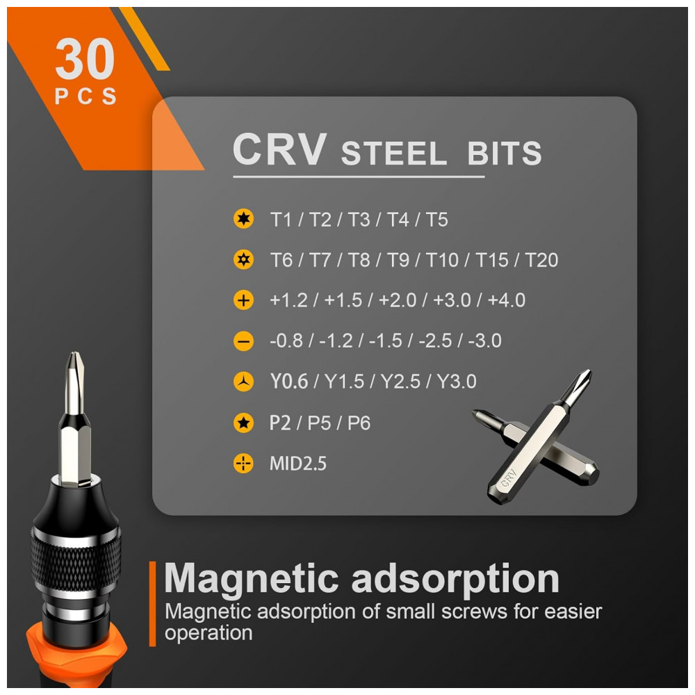 Bits em CR-V oferecem resistência à corrosão e fraturas, com tamanhos precisos de PH000 (+1,2 mm) a PH1 (+4,0 mm), flathead -0,8 a -3,0 mm, Torx T1 a T5, TR6 a TR20, triwing Y000 (Y0,6 mm) a Y1 (Y3,0 mm), pentalobe P2/P5/P6 e MID 2,5 mm.