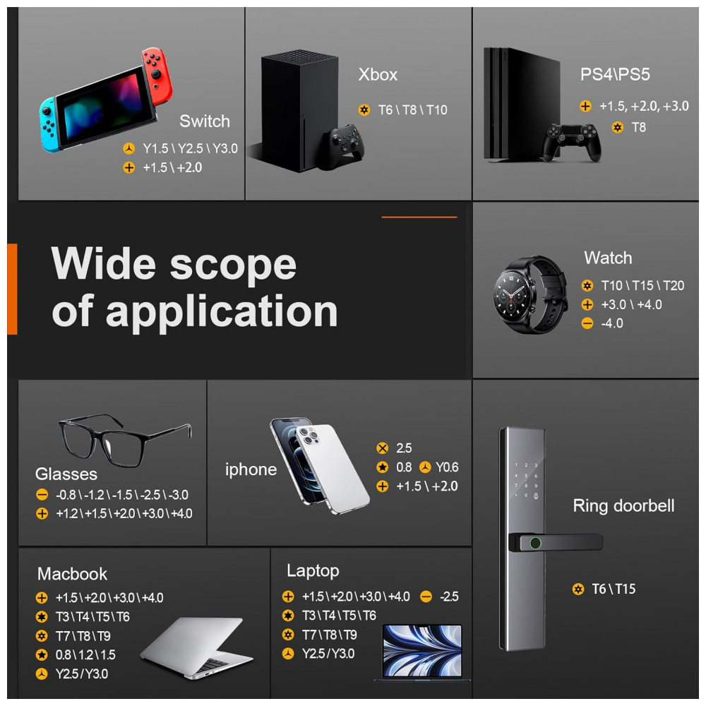 Compatível com iPhone 7-13 (+1,5/2,0 mm, P2, Y0,6 mm, MID2,5 mm), Samsung/Huawei (+1,2-3,0 mm, T2-5, P2), iPad/Air/Pro (+1,5-3,0 mm, T3-6/9), MacBook (+1,5-4,0 mm, T3-9, Y2,5/3,0 mm, P2/5/6), PS3-5 (T8, +1,5-3,0 mm), Xbox (T6/8/10), Switch (Y1,5-3,0 mm, +1,5/2,0 mm), laptops Dell/Acer (+1,2-4,0 mm, T3-9) e relógios/óculos (+1,2-4,0 mm, -0,8 a -3,0 mm).