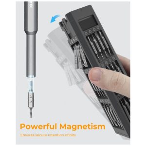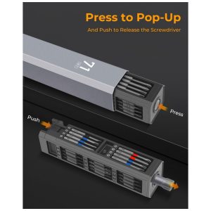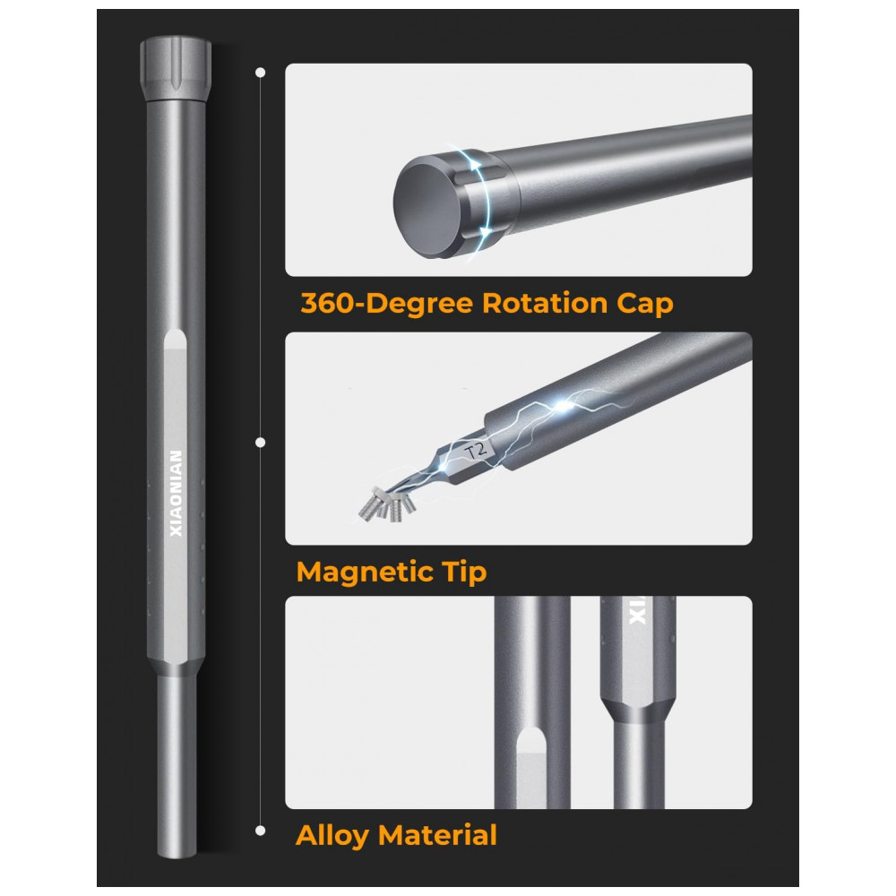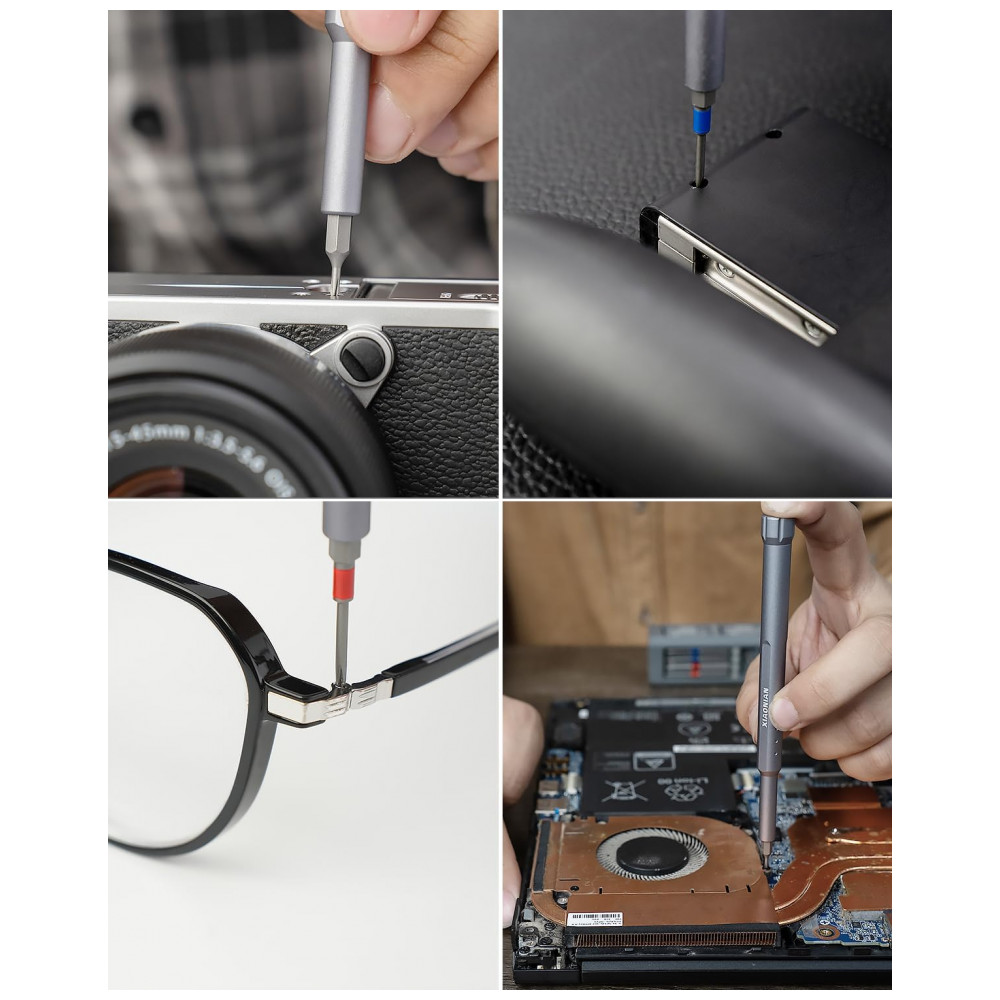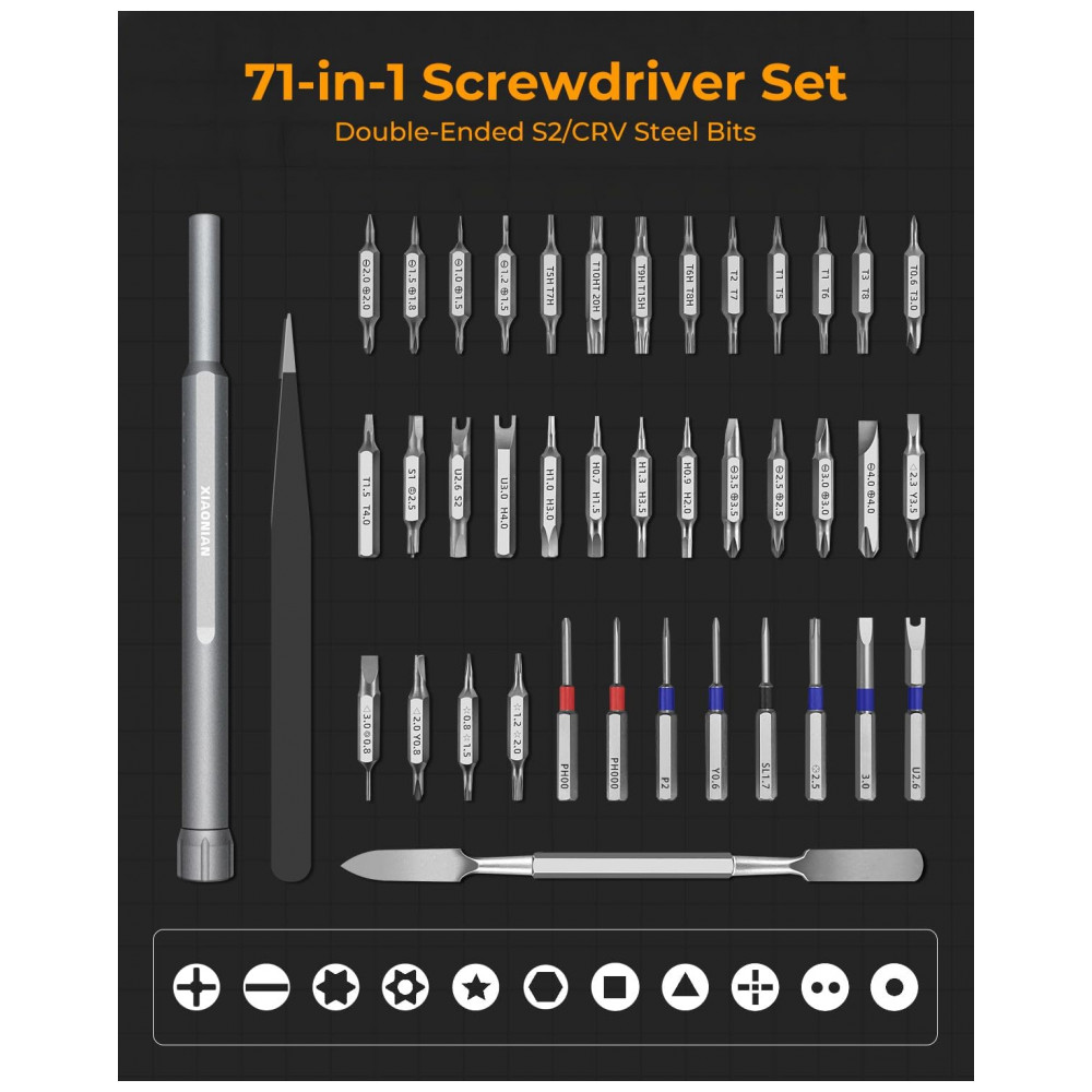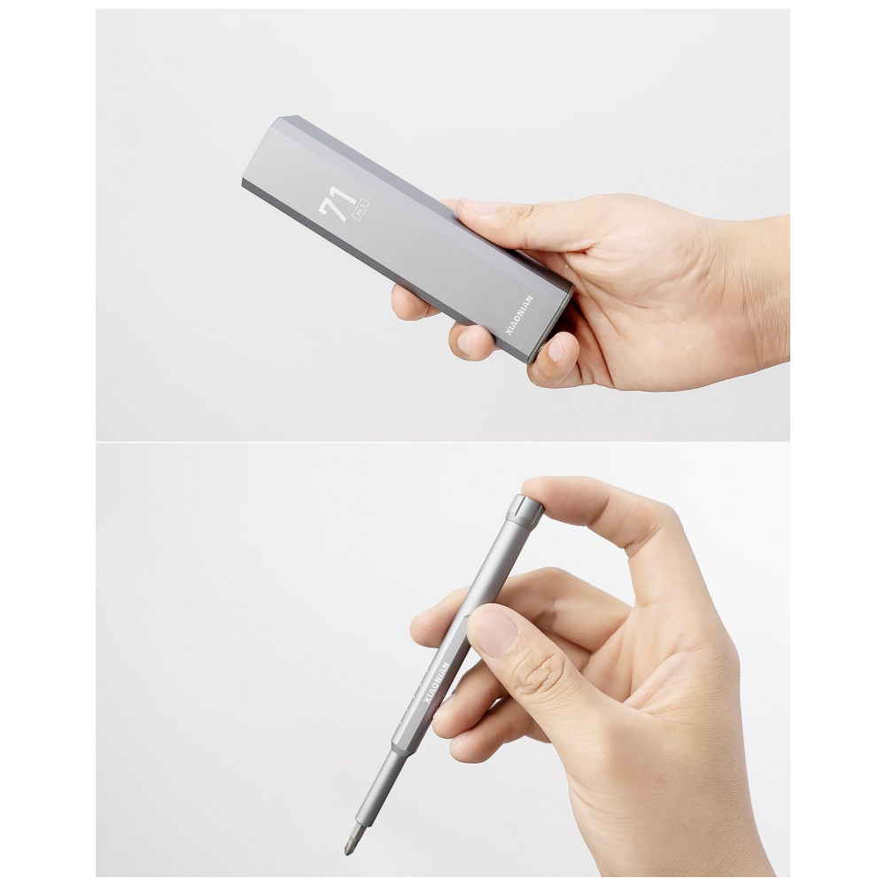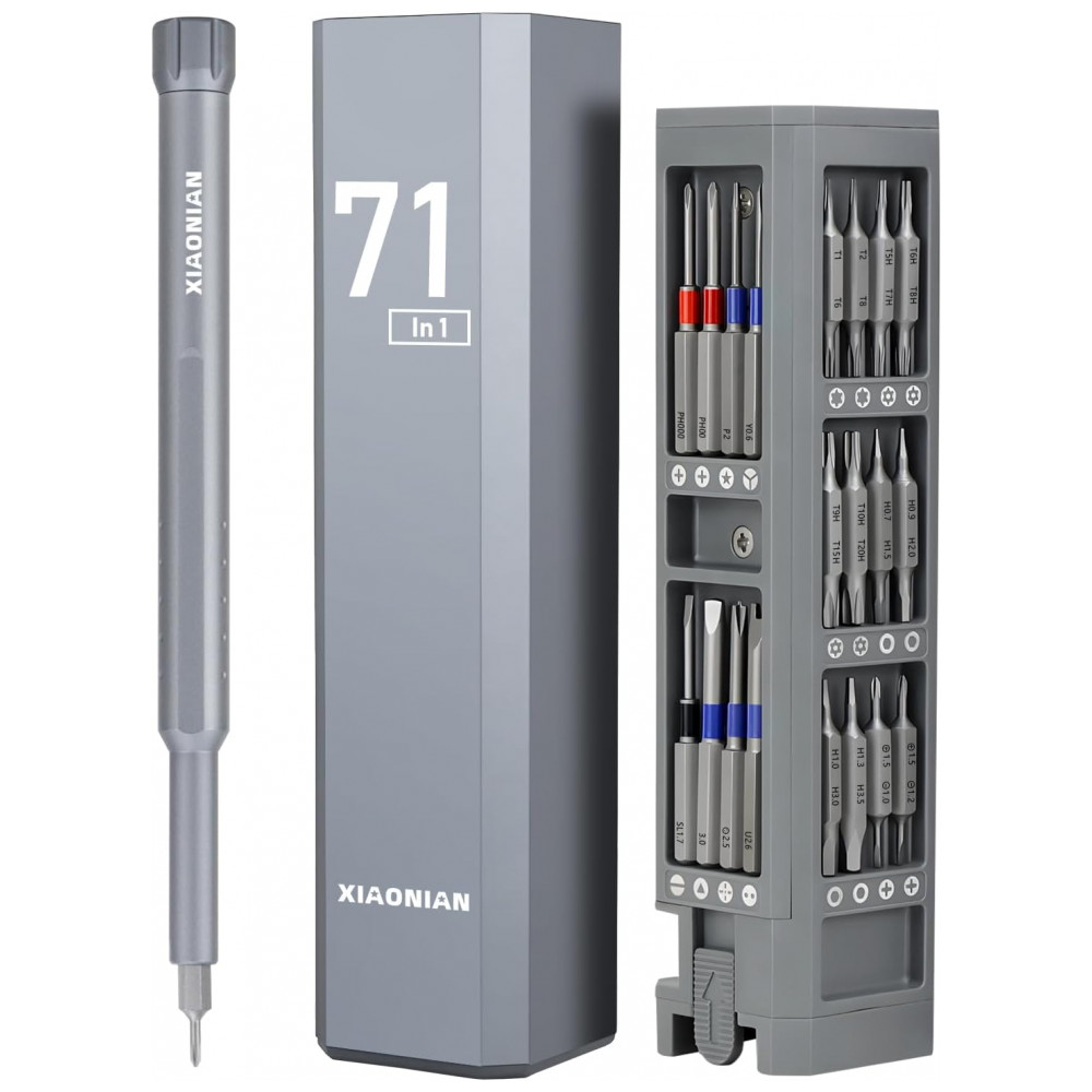Kit de chaves de fenda de precisão mini XIAONIAN com 71 peças, incluindo 30 bits duplos H4x28 mm em S2/CRV e 8 bits estendidos coloridos H4x39 mm (star, Phillips, pentalobe, Torx, hex, slotted, triangle, square) para reparos em smartphones, MacBook, PC, PS5/PS4, Xbox, relógios, óculos e Ring Doorbell. Design compacto com tampa rotativa 360°, cabo alumínio anticorrosivo e pulseira antiderrapante facilita manuseio prolongado em manutenções técnicas portáteis.
