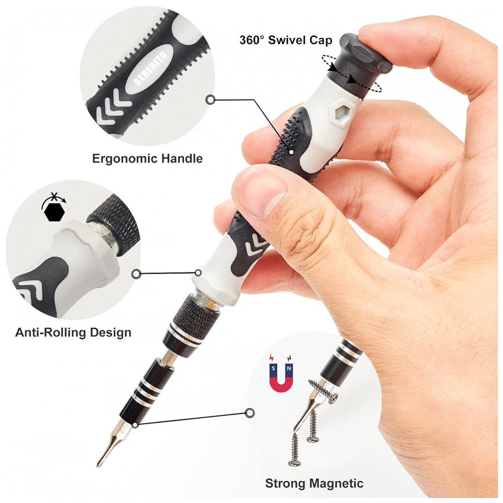 Kit de chaves de fenda de precisão STREBITO com 124 peças, incluindo 101 bits de 4 mm em aço cromo vanádio (60HRC) para reparos em smartphones Apple/Android, PC, laptops, iPhone, MacBook, Nintendo, PS5/PS4/PS3, Xbox, tablets e iPad. Inclui 23 ferramentas como magnetizador/demagnetizador, pinça ESD, tapete magnético, ferramentas de abertura, escova e panos para desmontagens técnicas completas em eletrônicos, relógios, óculos e brinquedos RC.