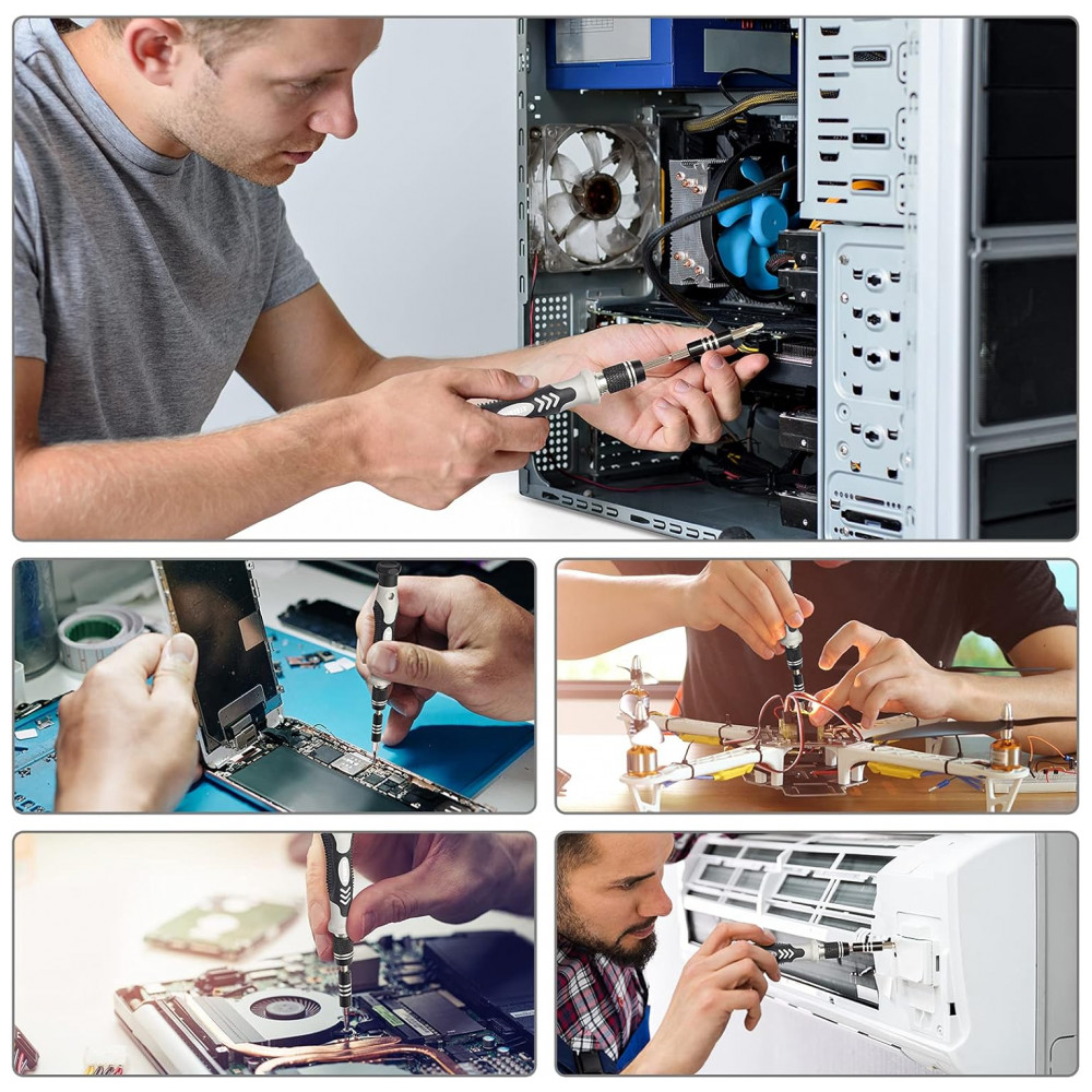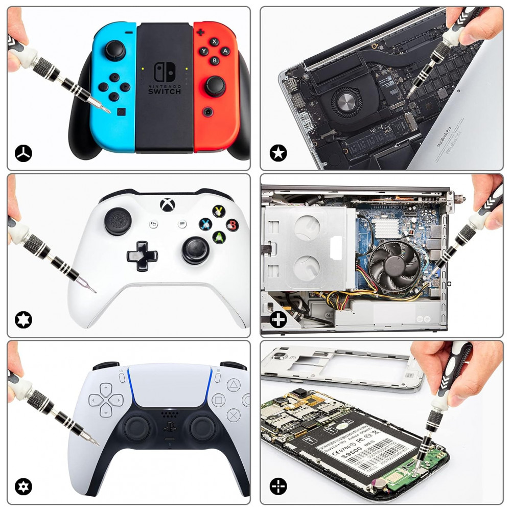• Conteúdo da caixa: 101 bits magnéticos (Phillips, flathead, Torx, pentalobe, hex, triwing etc.), 1 cabo ergonômico giratório, magnetizador, pinça ESD, tapete magnético, ferramentas abertura, eixo flexível 360°, escova/panos, case organizador