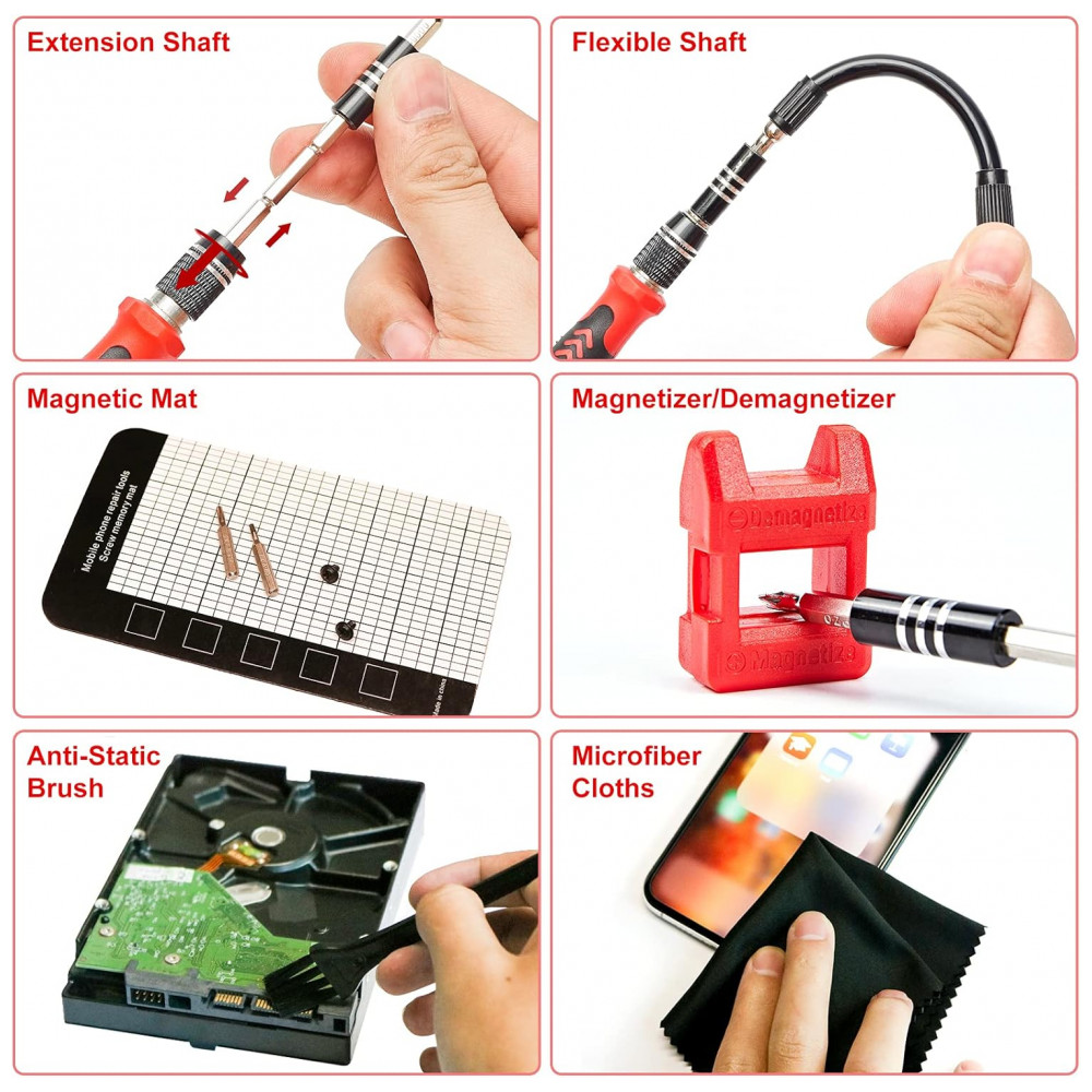 Eixo de extensão flexível 360° acessa locais estreitos; tapete magnético organiza parafusos removidos durante reparos.