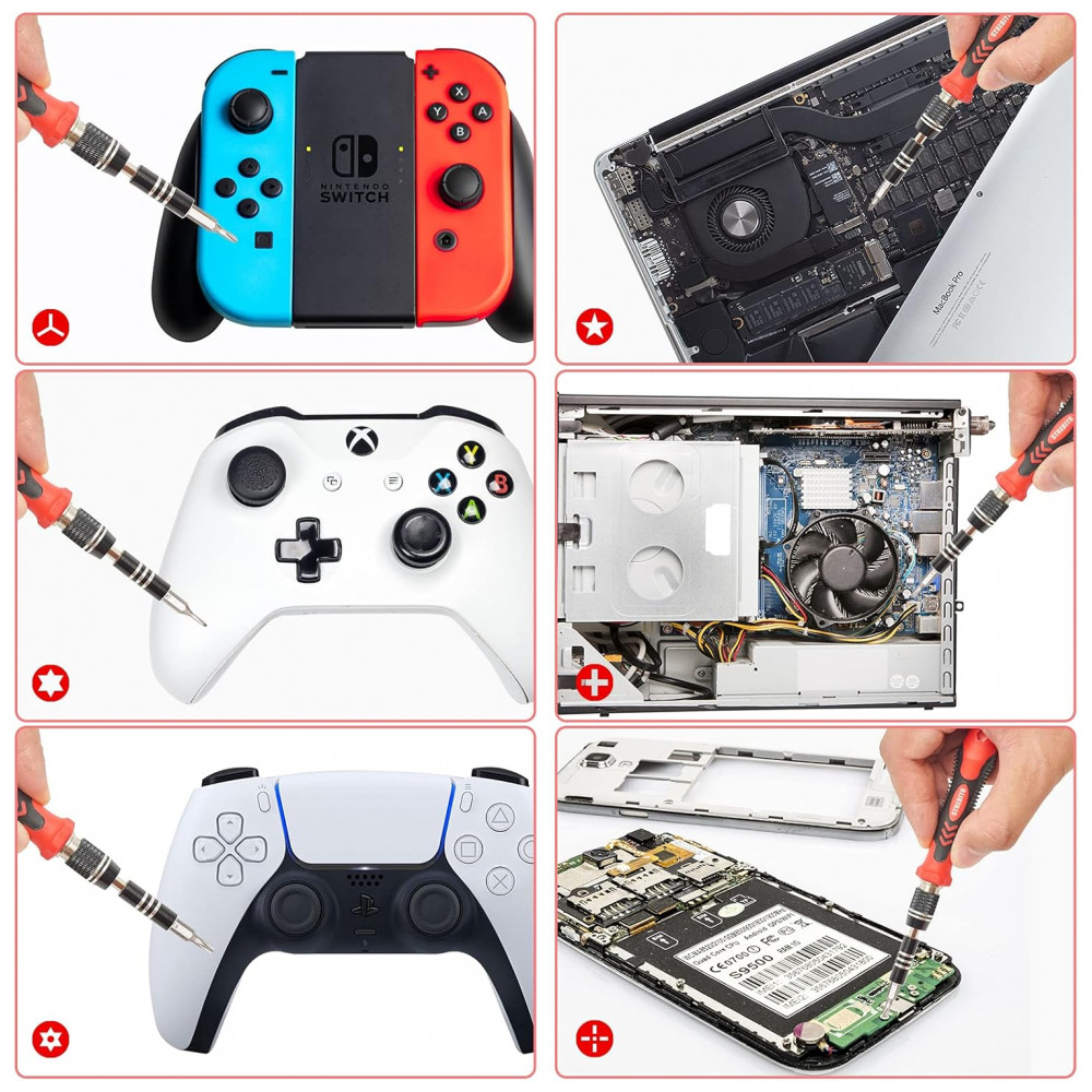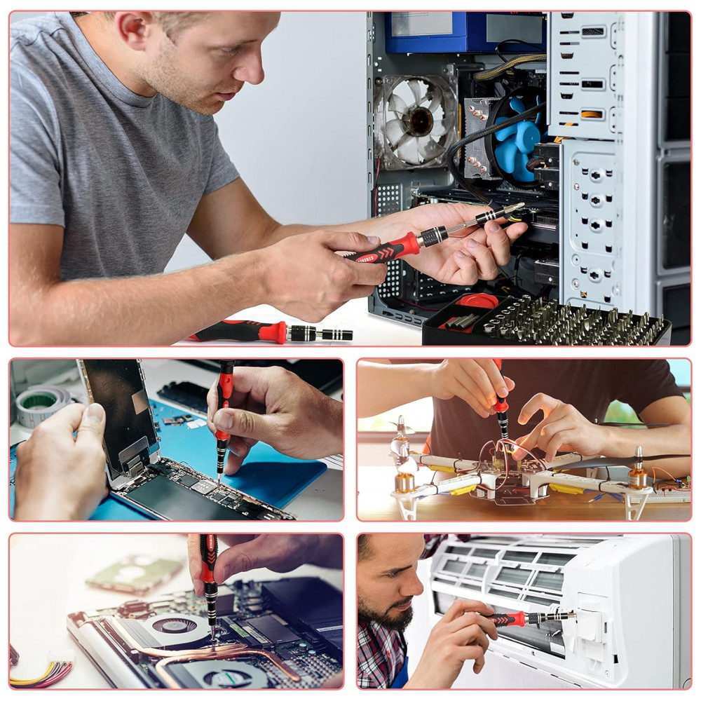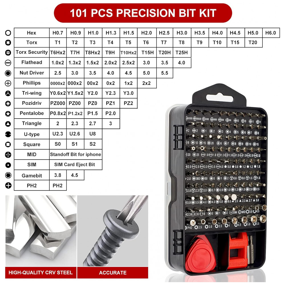 • Conteúdo da caixa: 101 bits magnéticos (Phillips, flathead, Torx, pentalobe, hex, triwing etc.), 1 cabo ergonômico giratório, magnetizador, pinça ESD, tapete magnético, ferramentas abertura, eixo flexível, escova/panos, case organizador