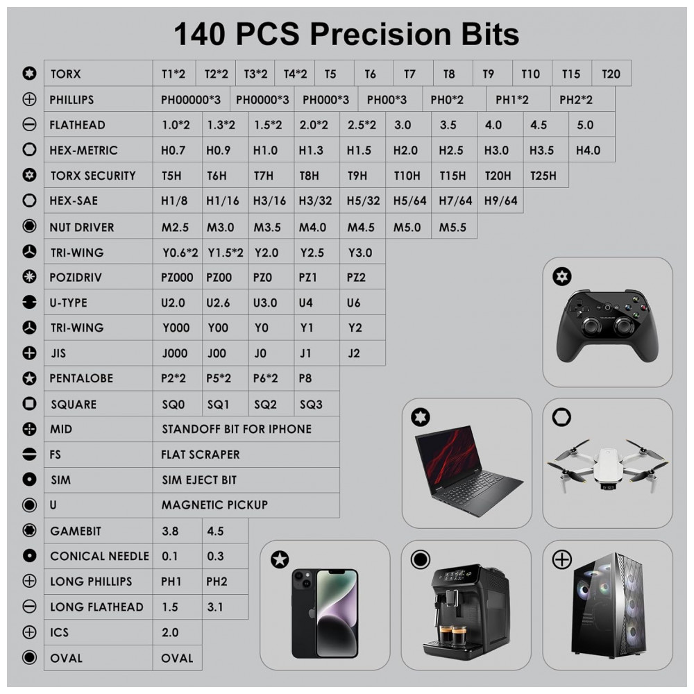 Kit de chaves de fenda de precisão projetado para reparos em dispositivos eletrônicos, como computadores, laptops, celulares, MacBook, controladores de jogos e drones. Inclui 140 bits magnéticos em formatos Phillips, Pentalobe, Torx Security, Hex SAE/métrico, JIS, flat head, triwing, triangle e square, compatíveis com ferramentas para reparo de eletrônicos, conserto de celular e manutenção de notebooks. O conjunto organiza acessórios em estojo rígido para transporte e armazenamento seguro.