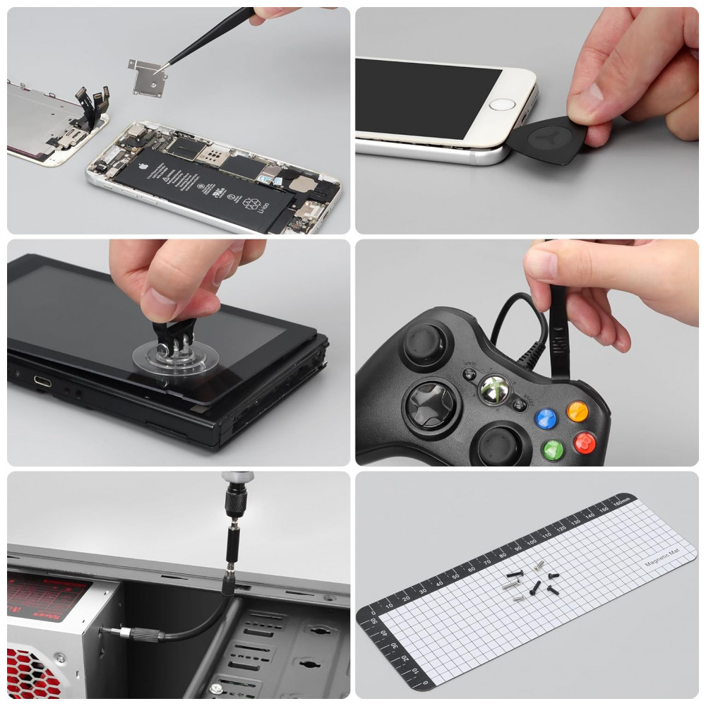 Funcionalidades abrangem 13 ferramentas auxiliares, como 4 bits de pescoço longo para parafusos profundos em controladores PS4 ou Nintendo Switch. Compatível com reparos em óculos, máquinas de café, campainhas Ring e dispositivos IT.