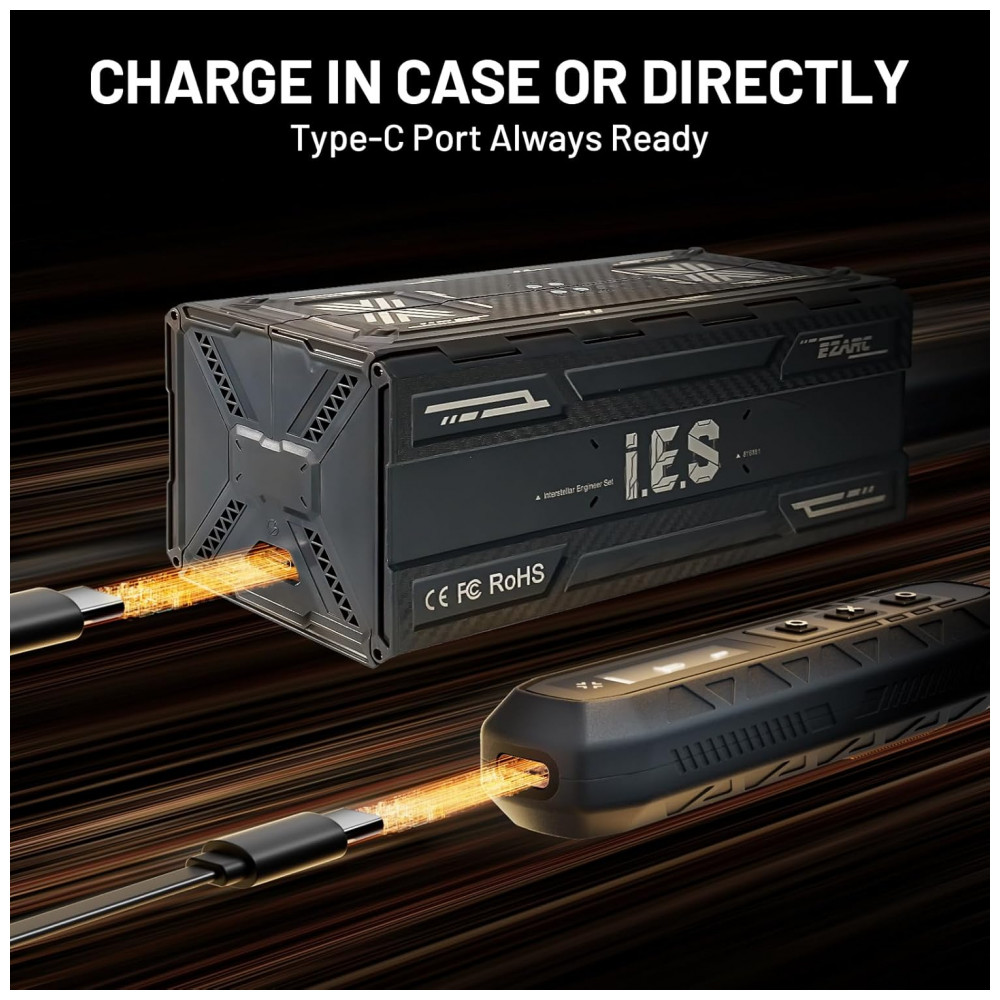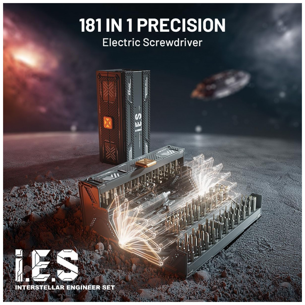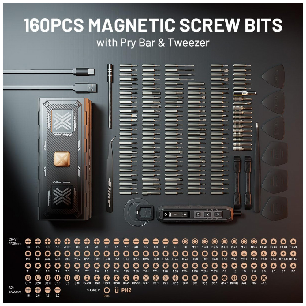 Kit de chaves de fenda elétrico de precisão EZARC com 181 peças, incluindo 160 bits CR-V e 4 bits longos S2 para reparos em smartphones, laptops, câmeras, relógios, Switch e computadores. Oferece 3 níveis de torque ajustável de 0,16/0,2/0,3 N.m mais torque manual de 3 N.m, com bateria recarregável de 500 mAh via USB-C (porta externa para carga sem remoção). Design com tampa flip e organização magnética facilita acesso a bits e 8 ferramentas de manutenção eletrônica em trabalhos técnicos.