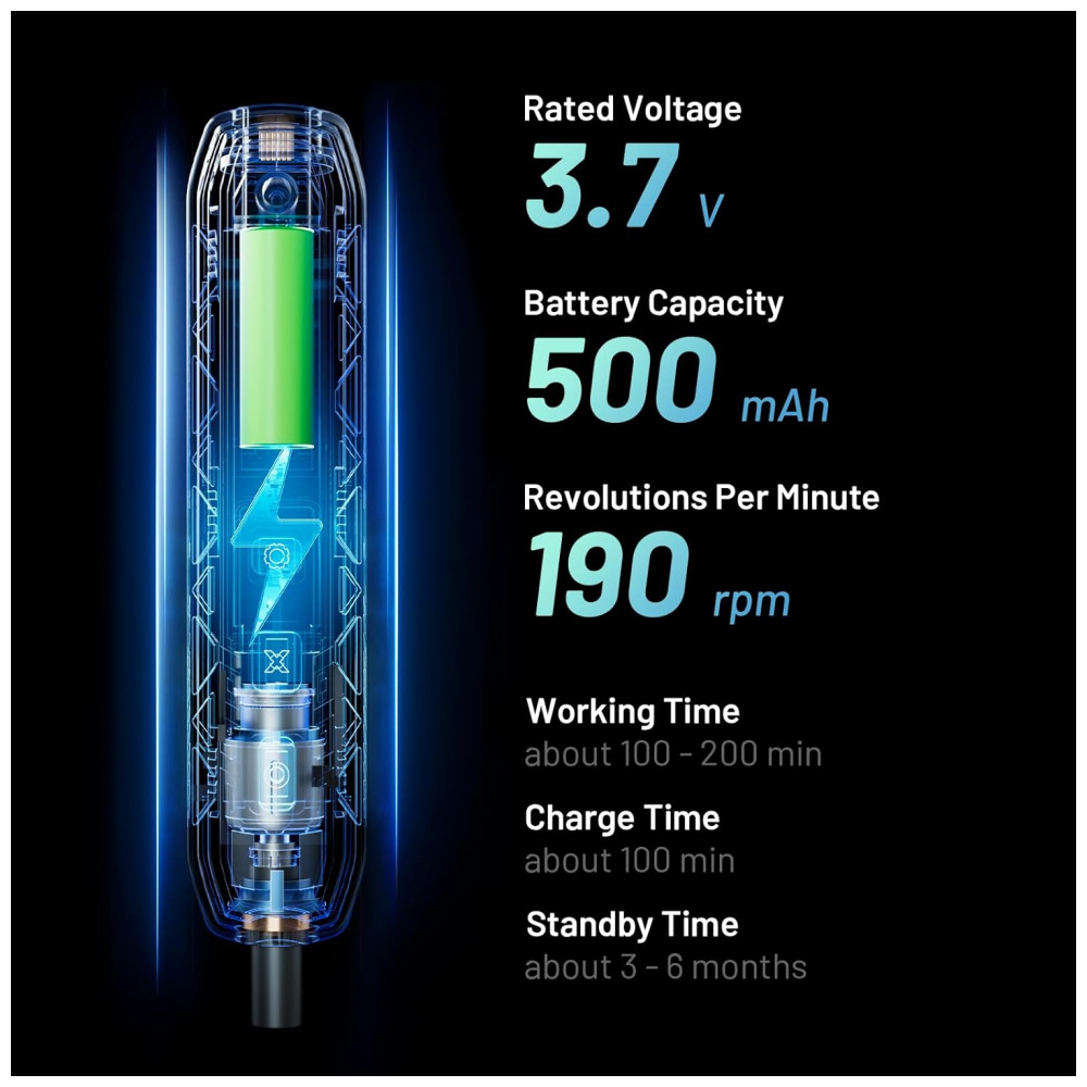 Motor elétrico com indicador de energia e 8 acessórios (pick de abertura, pinça ESD, barra pry, eixo extensão, ventosa) para desmontagens precisas.