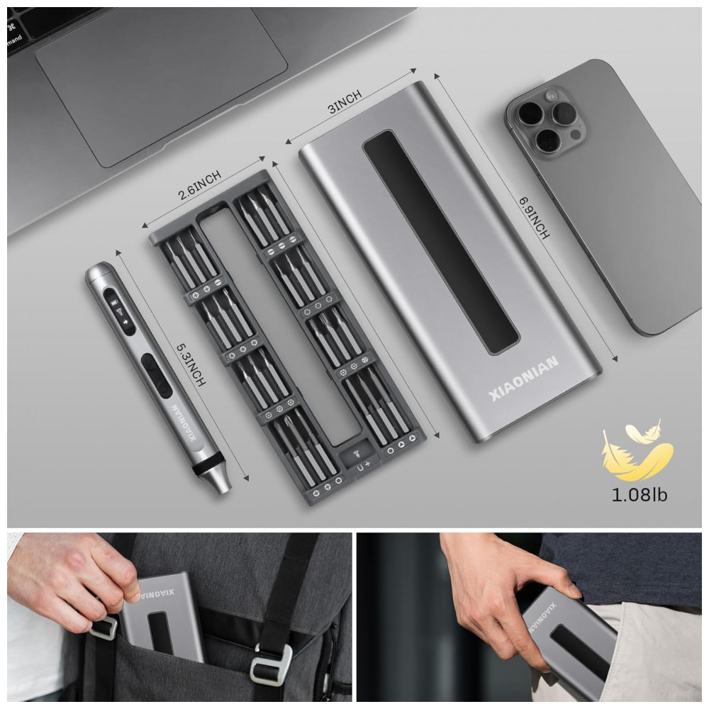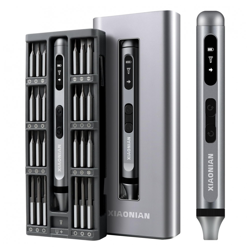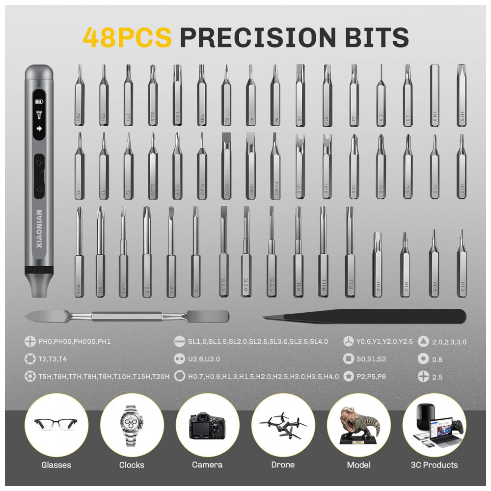 Kit de chaves de fenda elétrico de precisão XIAONIAN com 52 peças, incluindo 48 bits S2 magnéticos para reparos em smartphones, relógios, óculos, PC, câmeras e laptops. Motor sem fio a 200 RPM com modos elétrico (0,3 N.m torque) e manual (3,5 N.m torque), luz LED sem sombra e bateria Li 350 mAh (45 min carga via USB-C) suporta até 900 parafusos por carga ou 180 min contínuos. Construção toda metálica em liga de alumínio com case transparente permite recarga sem remoção da ferramenta.