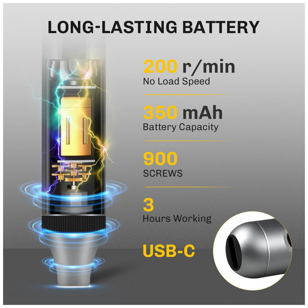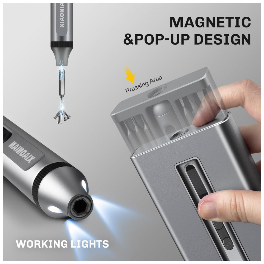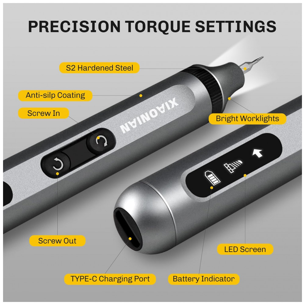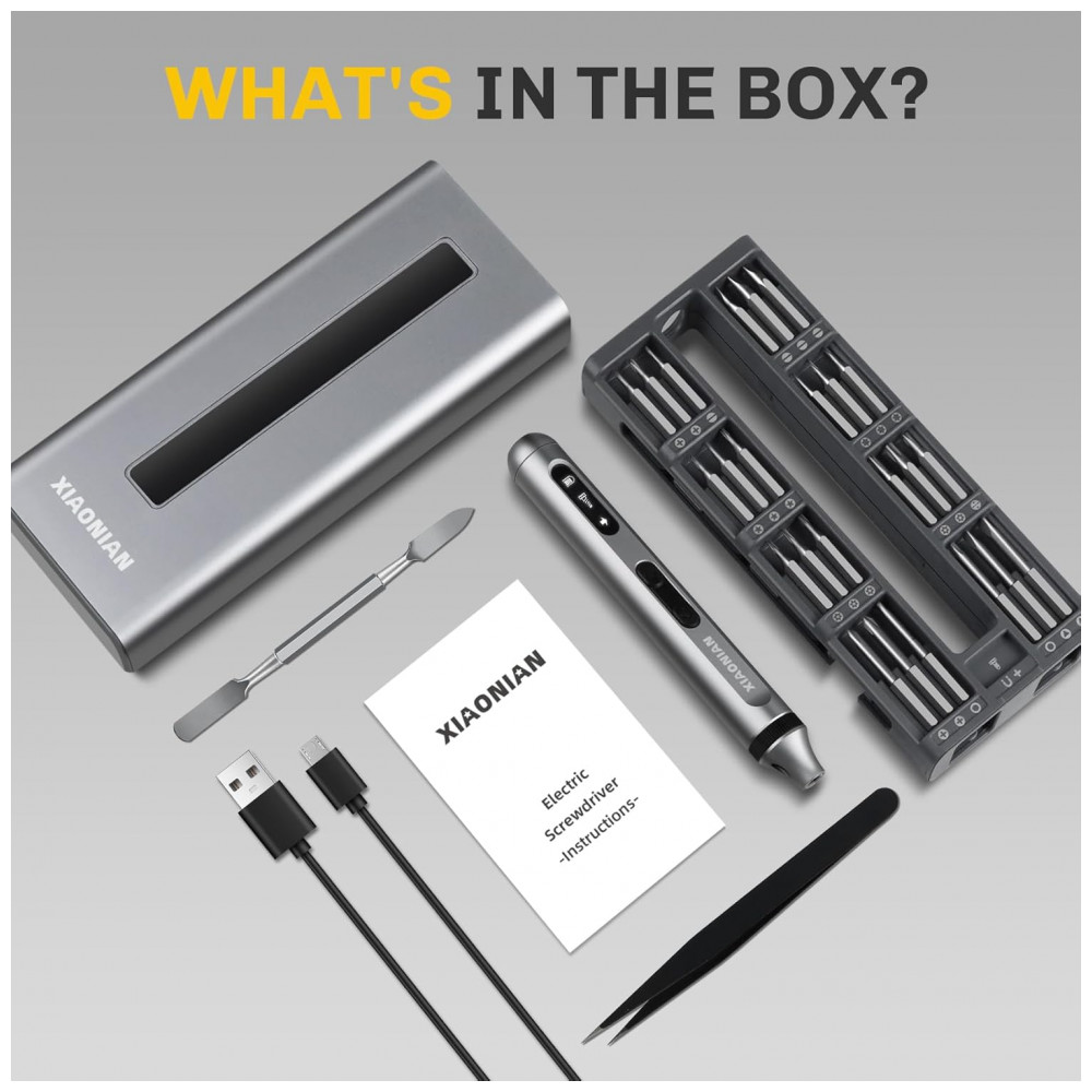 Kit de chaves de fenda elétrico de precisão XIAONIAN com 52 peças, incluindo 48 bits S2 magnéticos para reparos em smartphones, relógios, óculos, PC, câmeras e laptops. Motor sem fio a 200 RPM com modos elétrico (0,3 N.m torque) e manual (3,5 N.m torque), luz LED sem sombra e bateria Li 350 mAh (45 min carga via USB-C) suporta até 900 parafusos por carga ou 180 min contínuos. Construção toda metálica em liga de alumínio com case transparente permite recarga sem remoção da ferramenta.