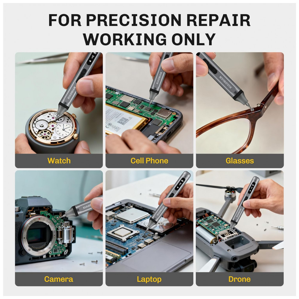 Compatível com tablets, celulares, smartwatches, drones e eletrônicos compactos com parafusos de precisão variados.